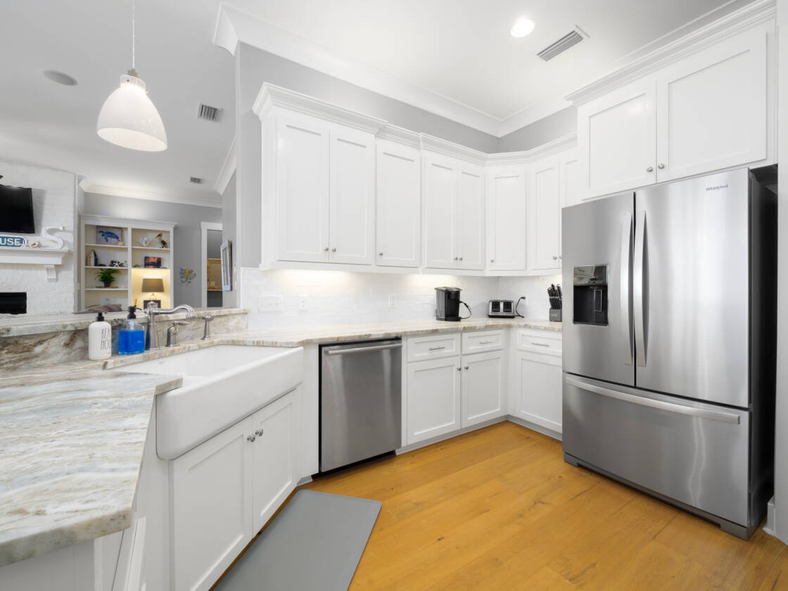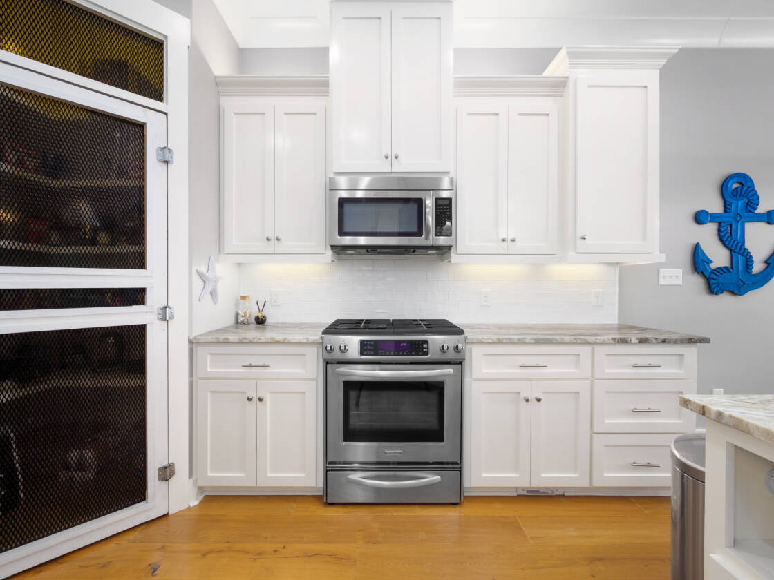 - The kitchen features stainless steel appliances, gas range, neutral granite countertops, painted shaker-style cabinets, a walk-in pantry, breakfast bar, and under-cabinet lighting.
