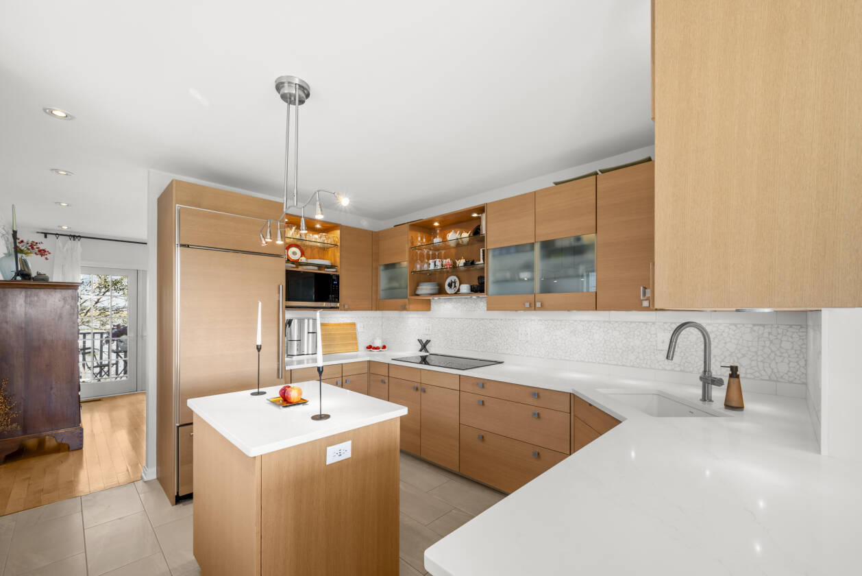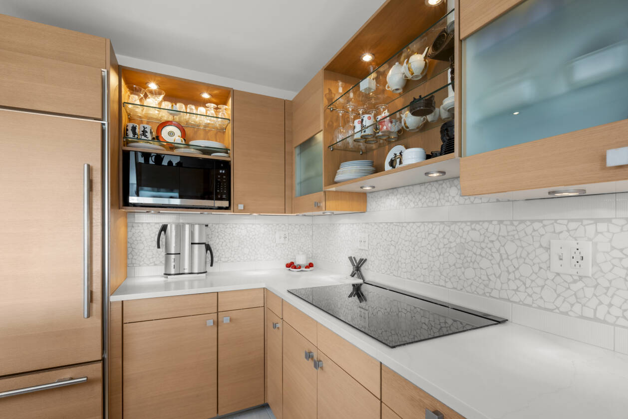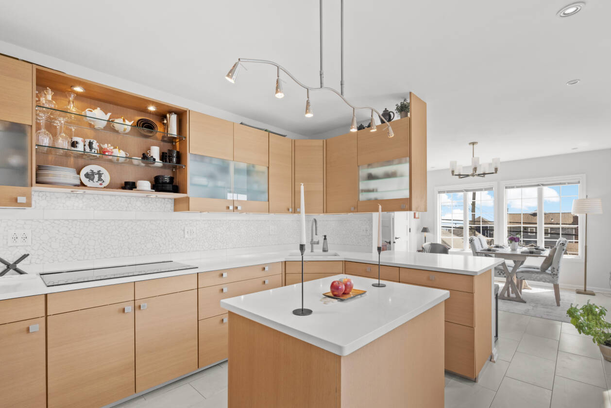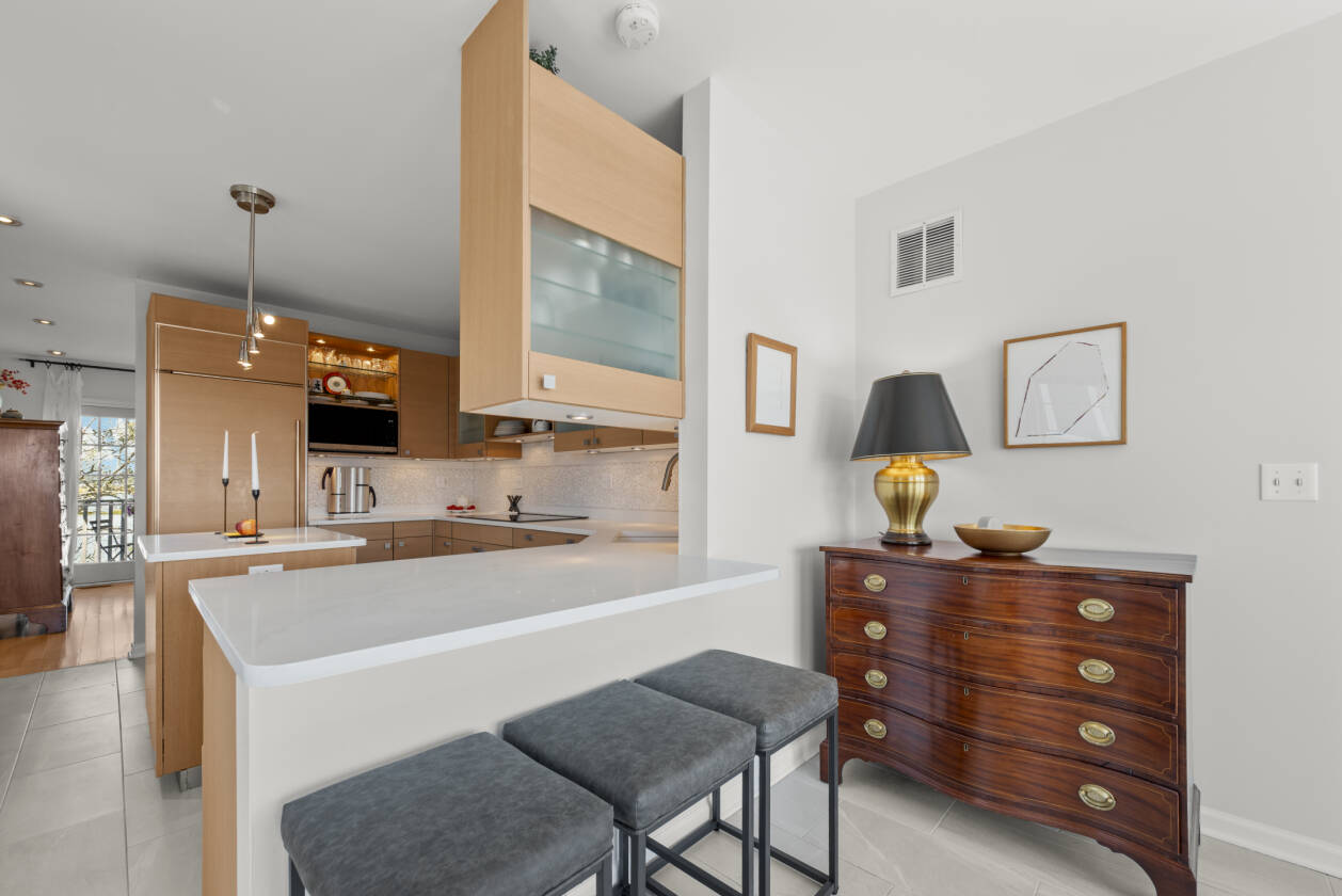 The flexible floor plan features three spacious bedrooms, each with a full bath, plus a dedicated home office and 3.5 bathrooms finished with marble and natural stone. Designed for both elegance and ease of living, the main level showcases unobstructed water views from the kitchen with imported Poggenpohl cabinetry and high-end appliances. The light-filled dining area and a living room with waterside deck is perfect for entertaining or quiet evenings overlooking the water.