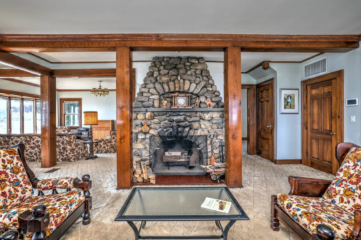 Inside, the main level features a gracious living room with a grand fireplace opening to a spacious waterside porch. A second fireplace warms the adjacent family room, located next to a first-floor bedroom and full bath. The main level also includes a second bedroom with bath, a formal dining room, family room and kitchen.