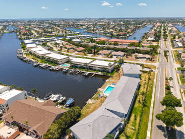 You've found your dream home in this direct Gulf access vacation or permanent condo home! Located on the wide Navajo Canal with your own boat slip and deeded dock, this home is offered fully turnkey! Just move in and begin enjoying Paradise in this lovely waterfront home. It has been fully updated and move-in ready for your enjoyment and comfort. The kitchen is a chef's dream with an oversized island breakfast bar, beautiful granite, high end cabinetry with pull out shelves and soft-close doors, appliances are stainless steel and included, as well as washer & dryer at the inside laundry room with extra storage. The primary bedroom has a large walk-in closet, en-suite bath with double sink vanity plus an extra closet.....all beautifully redone. The guest bedroom has large double closet and plenty of storage with an extra closet. The guest bathroom has also been redone with all newly tiled shower & vanity. Enjoy your morning coffee or evening beverage overlooking the peaceful waterway in the newly screened lanai with access from the living area and primary bedroom via new wind rated impact sliding doors. The lanai also has roll down shutters and the front door and side glass panel are also impact resistant for your peace of mind. All new wind resistant sliding windows have now been installed. New A/C unit and new hot water heater, plus new recessed lighting in primary bedroom add to your comfort. There is an extra storage closet outside, adjacent to your covered parking, plus a large community pool just steps away. This location off Beach Parkway is very centrally located with easy access to all Cape Coral's shopping, dining, parks, events and entertainment venues galore. Adjacent Jaycee Park, directly on the Caloosahatchee River, is currently undergoing major renovations and improvements for everyone's pleasure. As well, exciting new dining and recreational venues are coming soon for more boating and dining access nearby. By boat you'll enjoy direct access to The River, The Gulf, and popular beaches, fishing and waterfront dining. The Commodore Condo community has undergone many improvements including new metal roof, freshly paved walkways and pool deck, updated dock slips and new carport coverings. Call now to make your personal appointment to see this lovely condo home and begin enjoying the SW Florida lifestyle!