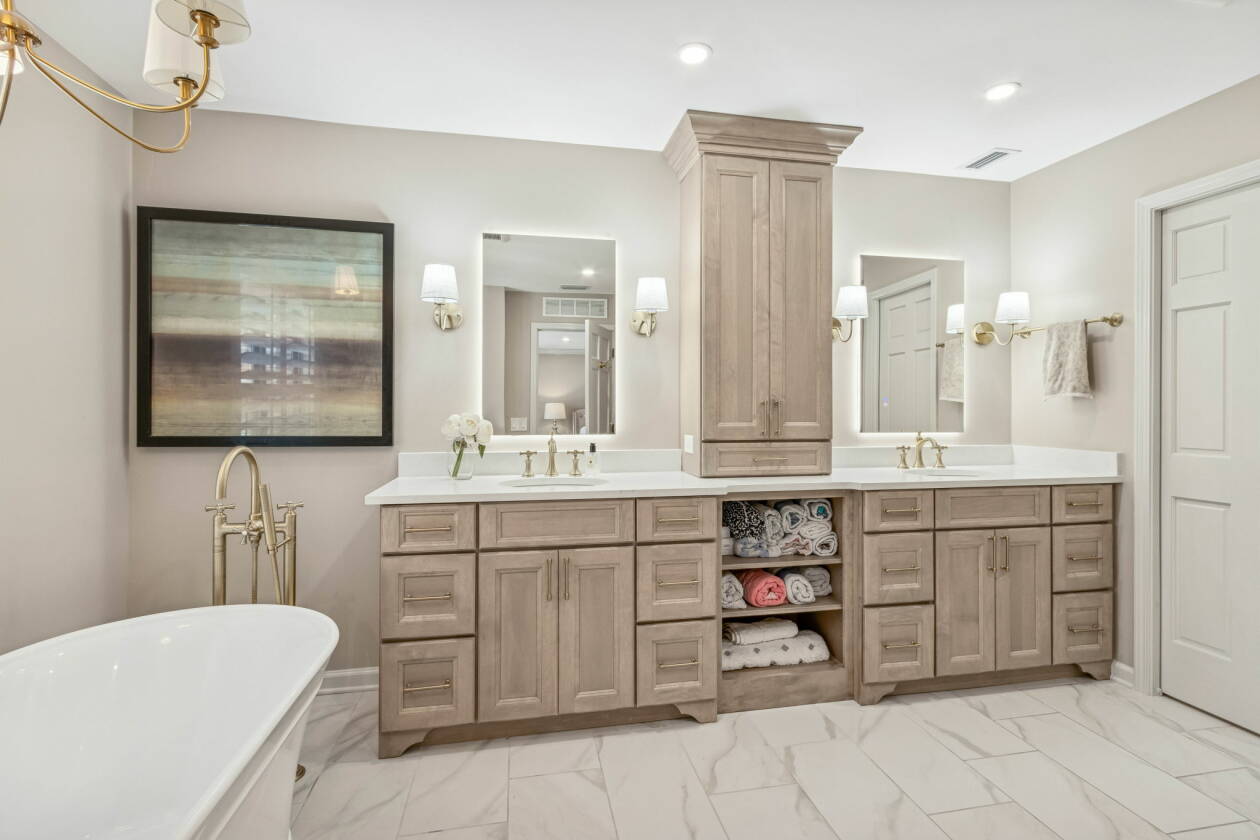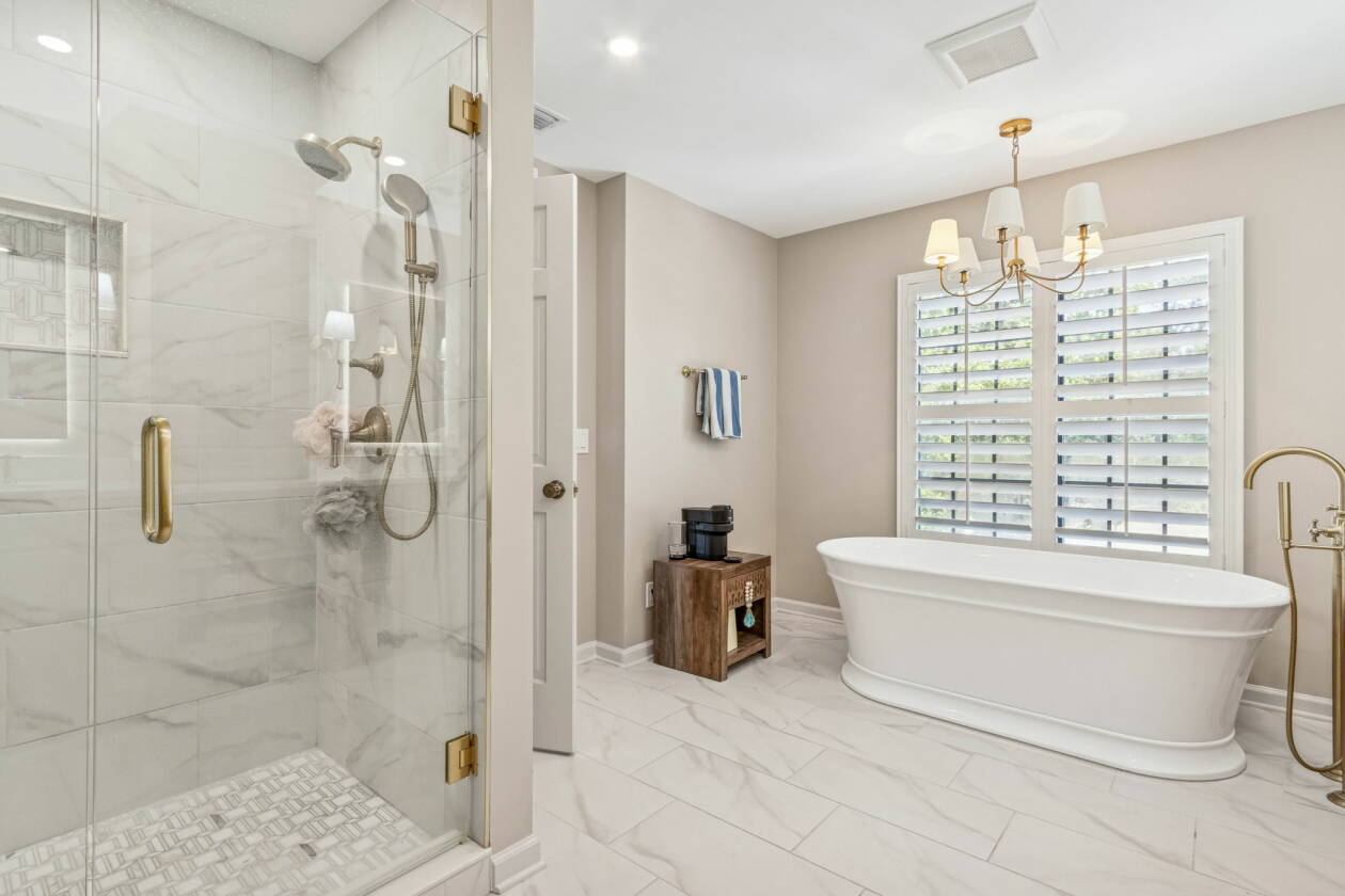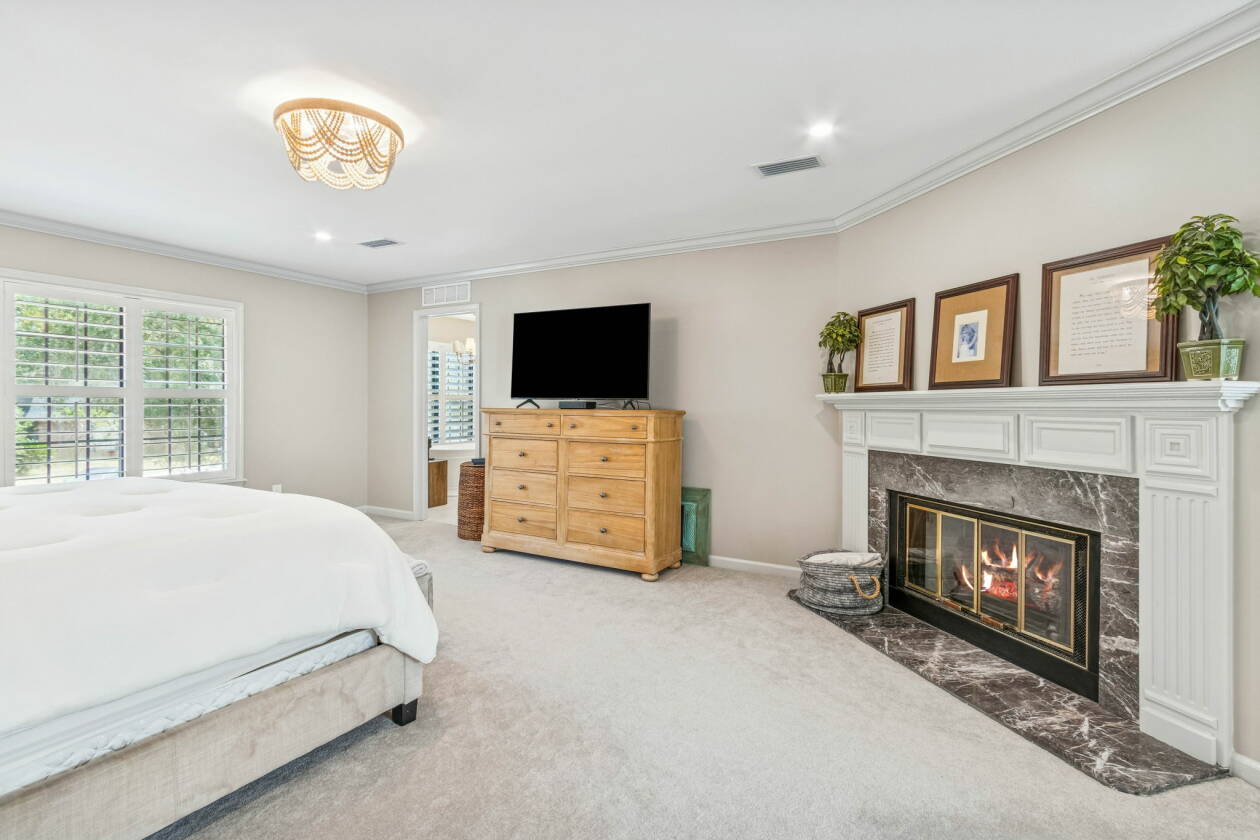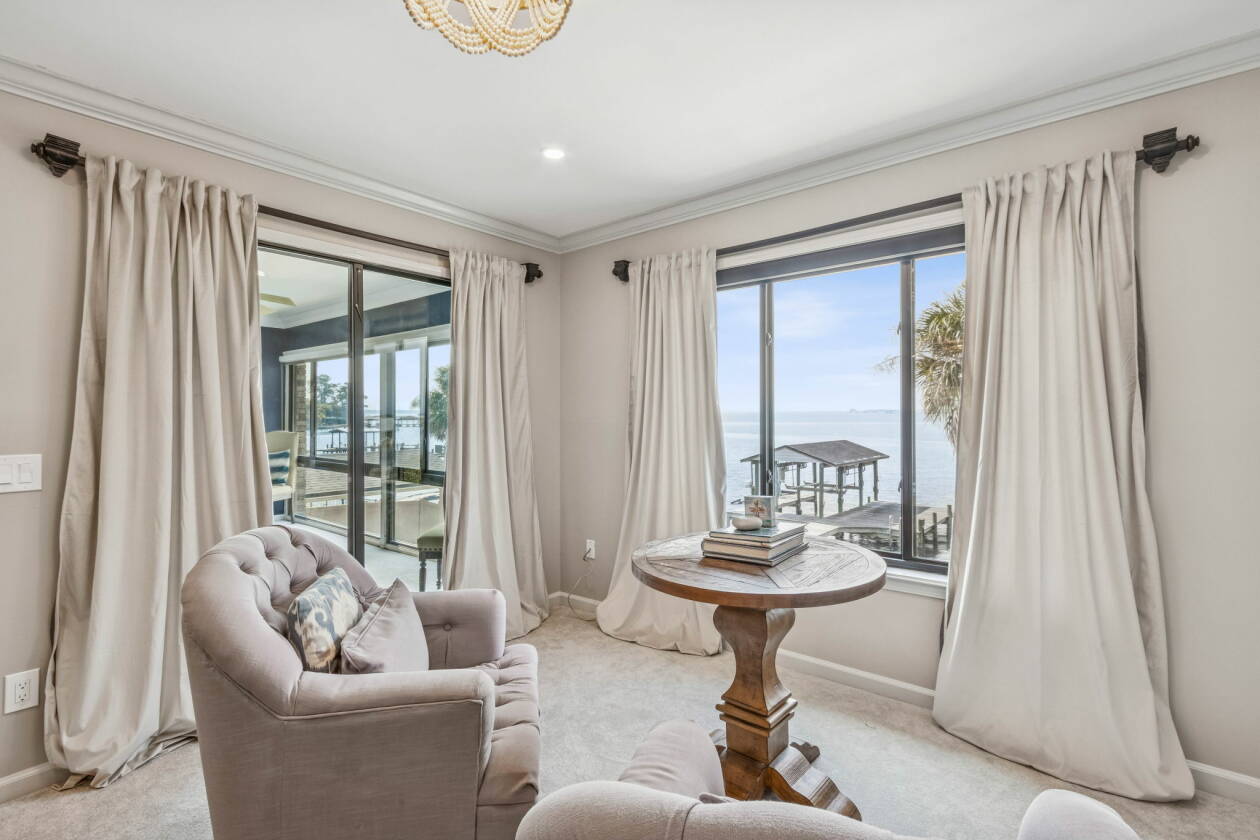 Upstairs, the expansive primary suite is a serene sanctuary, complete with a sitting area, gas fireplace, custom cabinetry, and a spa-inspired bath. Quartz countertops in the primary suite, create a cohesive, upscale aesthetic. A custom-designed closet elevates the experience further, offering both function and luxury. Just off the primary suite, a sunroom captures stunning river views and sunsets and could easily be converted into a private balcony--an ideal space for morning coffee or evening relaxation.
