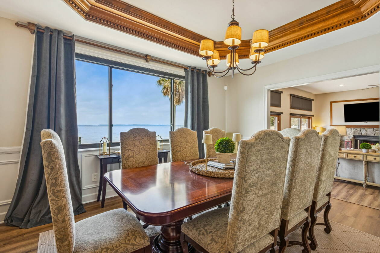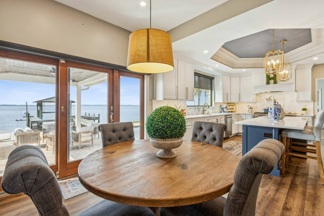 Perfectly positioned along the St. Johns River with coveted east/west exposure, this exceptional waterfront residence offers cinematic sunsets and sweeping river views from nearly every angle. Nestled on a quiet street, the home has been thoughtfully updated to reflect a refined blend of timeless elegance and modern luxury. The Kitchen is a true centerpiece, showcasing custom cabinetry, quartz countertops, high-end stainless steel appliances, a gas cooktop, and an oversized island--perfect for elevated entertaining with river views as the backdrop. Gas fireplaces and a gas kitchen range are supported by a 500-gallon tank, adding both efficiency and ambiance. Formal and casual living spaces flow effortlessly, enhanced by curated finishes and architectural detail throughout. The main level offers exceptional versatility with two bedrooms, a private study, a formal dining room, and two beautifully appointed full bathrooms. The downstairs baths feature designer seagrass wallpaper, adding texture, warmth, and a boutique-hotel feel, while one bath also serves as a convenient pool bath for seamless indoor-outdoor living.