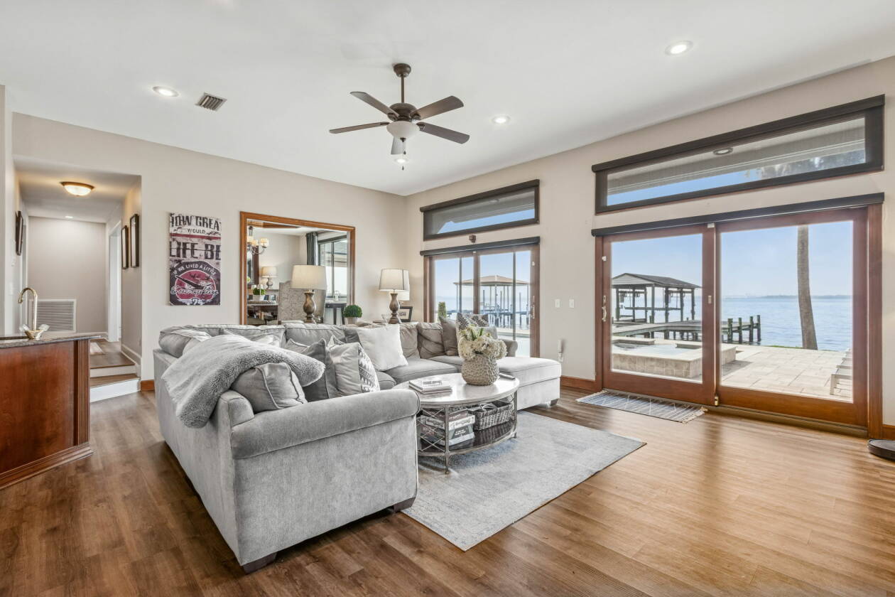 Outdoors, the property transforms into a true riverfront retreat. The heated saline pool and hot tub overlook the wide, navigable waters, complemented by a firepit designed for sunset entertaining. A covered lanai features an oversized six-speed fan which creates an inviting outdoor living room year-round. The deep-water dock is equipped with a boat lift and two jet ski lifts, offering effortless access to boating, kayaking, fishing, and sunset cruises on the St. Johns River.