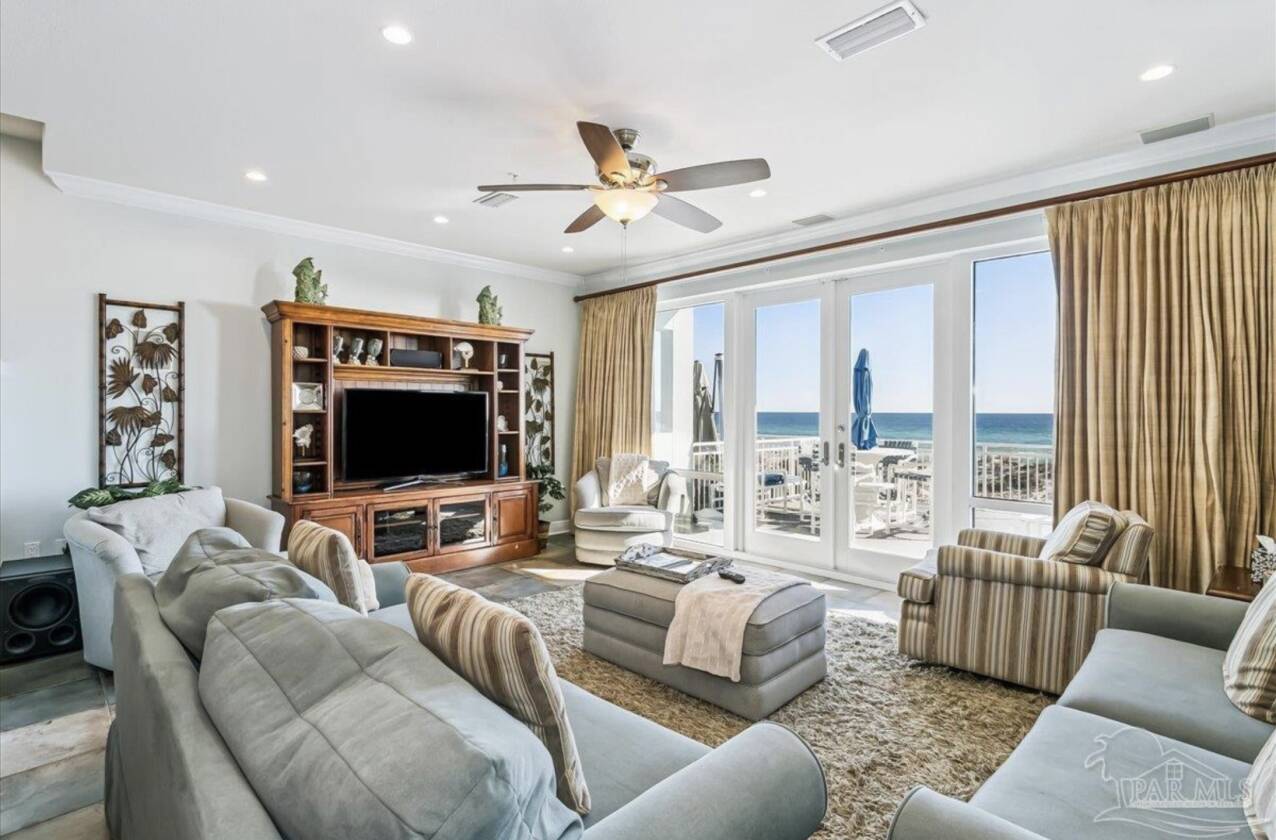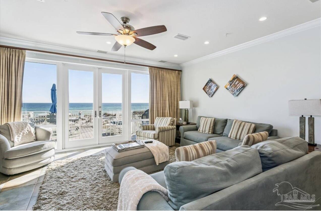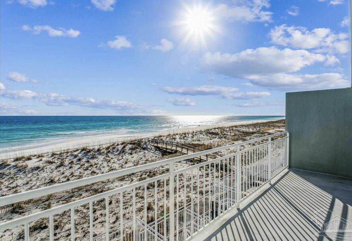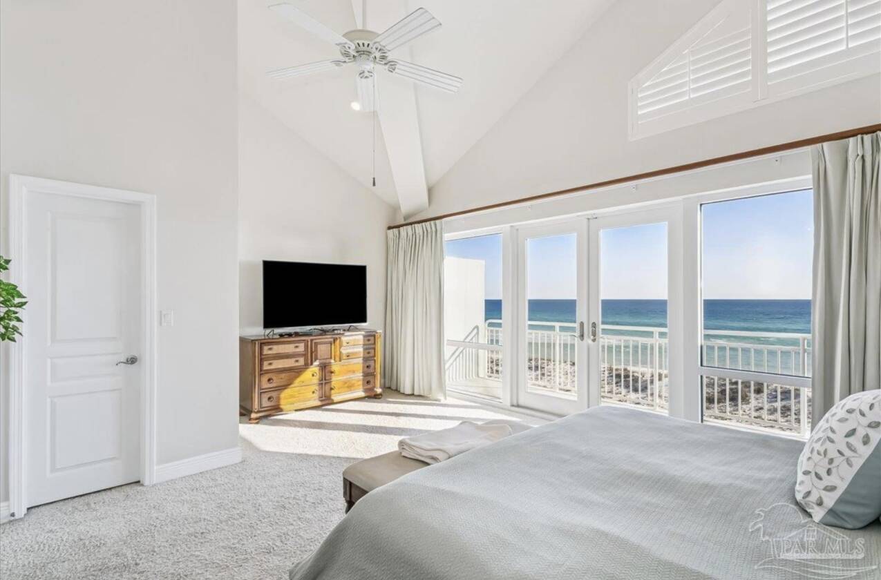 Gulf-Front Luxury Townhome | Elevator | Five Private Outdoor Spaces | Turn-Key Opportunity This rare Gulf-front luxury townhome presents an exceptional opportunity for second-home ownership, high-demand vacation rental investment, or an executive corporate retreat. Located in the highly desirable White Sands community on a quiet stretch of Fort Pickens Road, the property combines privacy, walkability, and unobstructed coastal views—features that consistently drive long-term value and rental performance. Fully furnished and elevator-served, the residence offers 180° panoramic views spanning the 1500' of Gulf, Pensacola Pier, and eastward coastline. Floor-to-ceiling Gulf-facing windows throughout the main living level maximize natural light and showcase dramatic water views, enhancing both lifestyle enjoyment and guest appeal. Designed for flexibility and multi-user occupancy, the layout includes multiple private suites, ideal for hosting corporate guests, extended family, or maximizing rental versatility. 4 Bedrooms, 3 king rooms, 4th bedroom- 2 sets twin/double/twin bunks highlighted by an expansive 25’ x 25’ main Gulf-front deck—create multiple outdoor activities for rare Diamond! The open-concept living area and chef-style kitchen feature professional-grade appliances, granite countertops, custom cabinetry, and a large 12’ bar—well-suited for group gatherings, corporate hosting, or vacation entertaining. The Gulf-front owner’s suite functions as a private retreat with direct balcony access, sweeping views, and a spa-style bath, while additional bedrooms enjoy private balconies with views of Sabine Bay. Direct stair access to a nearby dune crossover allows immediate access to miles of pristine white-sand beach—an amenity highly valued by both luxury renters and executive clients. Walkability to Casino Beach, the Pensacola Beach Boardwalk, and Peg Leg Pete’s, paired with proximity to the National Seashore and Historic Fort Pickens, add to uniqueness.