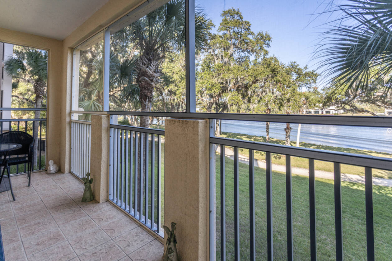 The expansive living room extends the outdoor connection with its own access to the oversized screened balcony, perfect for alfresco dining, quiet lounging, or simply taking in the serenity of the water.