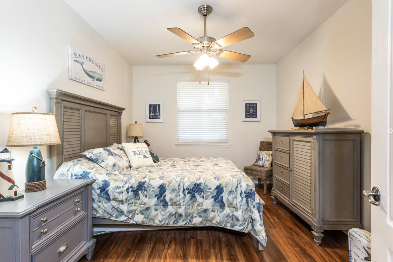 For those who want a great water view, the spacious primary suite is a true highlight. Wake up to water vistas, with sliding doors that lead directly to the screened balcony, your private front-row seat to daily scenes of dolphins gliding by, sailboats drifting past, and soft, peaceful sunrises. The ensuite bathroom features a walk-in shower, garden tub, and a generous walk-in closet.