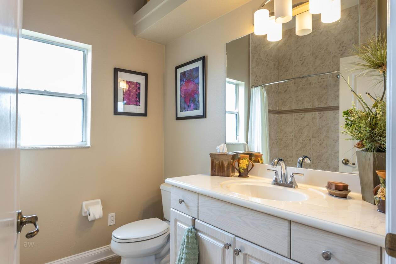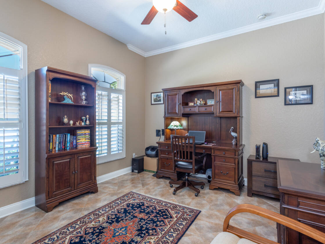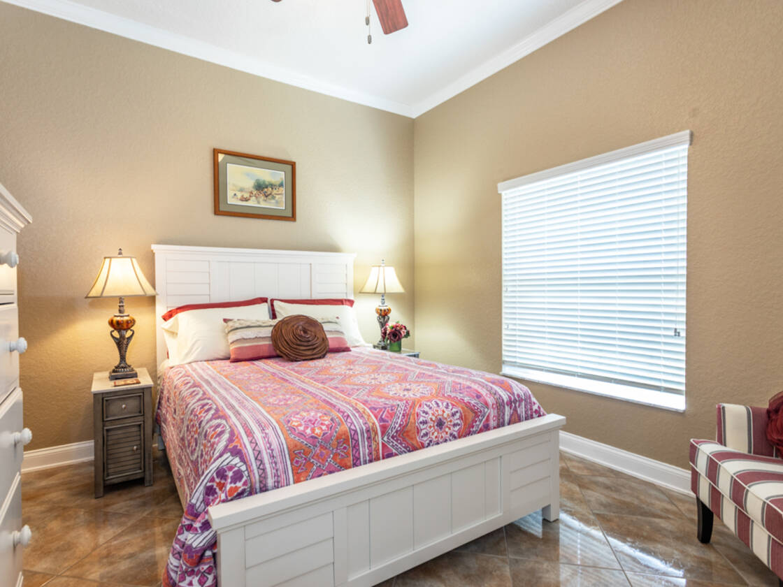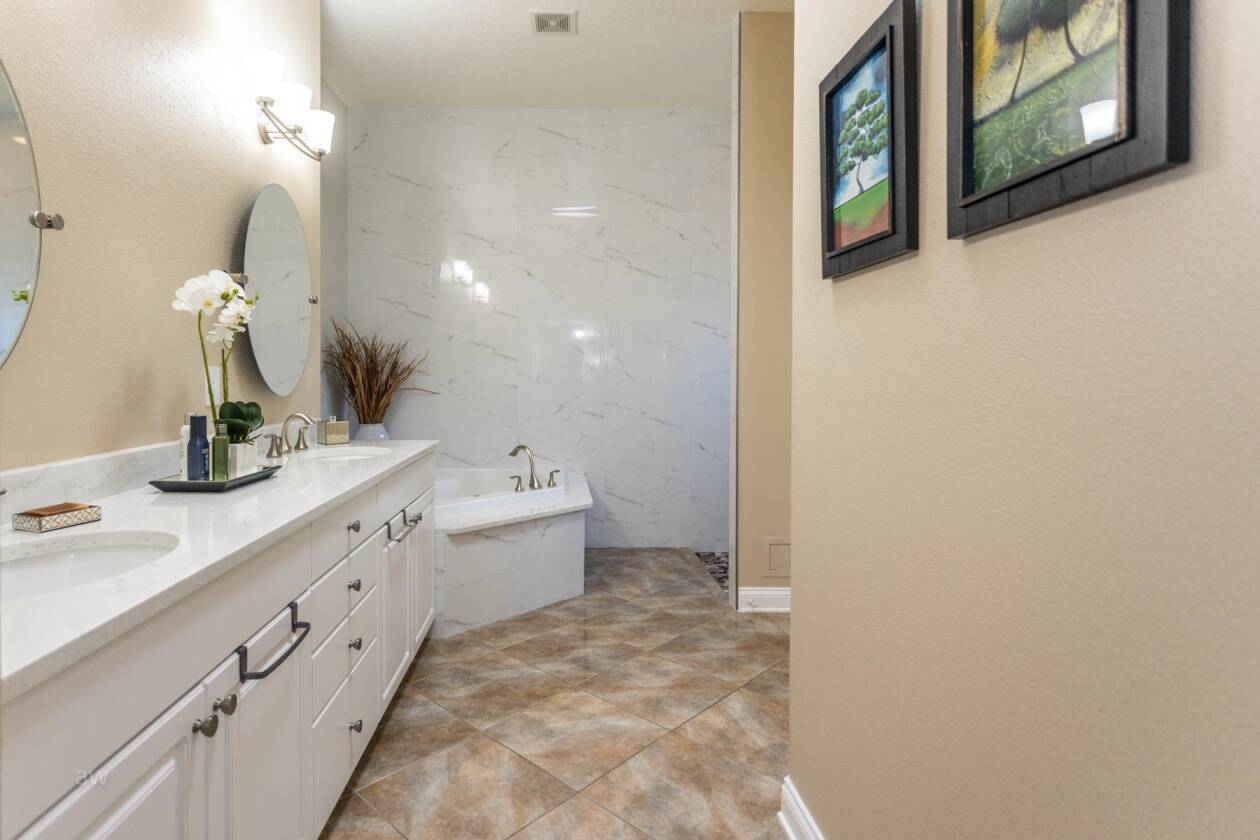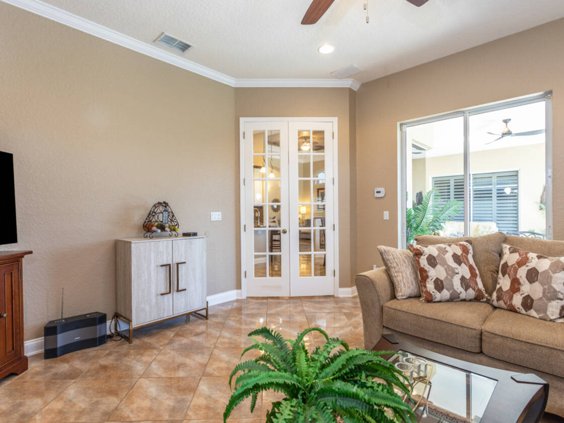 The spacious owner’s suite offers a spa-like retreat with a jetted soaking tub, walk-in shower with bench, and double quartz vanities. Multiple sets of French doors open to flexible spaces, including a private den with lanai access and a 4th bedroom/office. Enjoy tile flooring throughout, plantation shutters, an electric front door screen, two AC units for zoned comfort, and sun tunnels that fill the bathrooms with natural light.