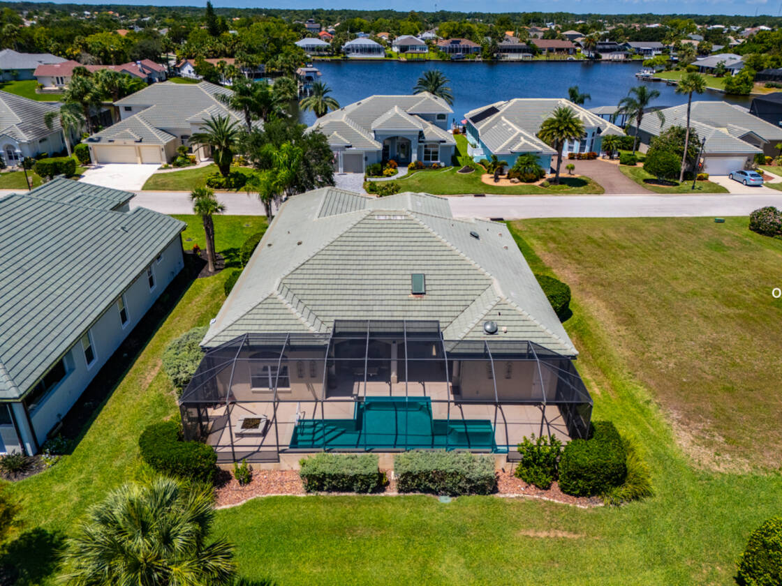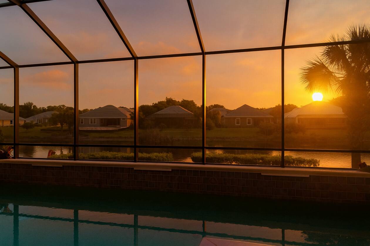Step outside to your own private resort: a custom-designed pool with cobblestone decking, a covered dining/sitting area, and a cozy gas firepit—all overlooking the serene lake and surrounded by lush Florida landscaping.