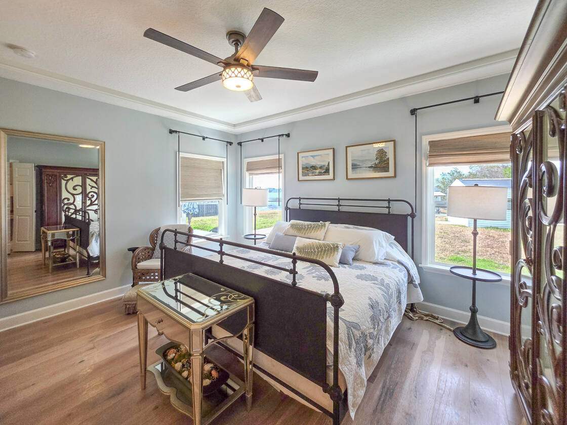 Two primary en-suites; one upstairs and one downstairs, provide multiple options for long term guests, private retreats, or generational living. The third bedroom upstairs has its own full bath just across the hall. A landing with a balcony at the top of the stairs provides a bird's eye view of the lake while welcoming in the morning light.