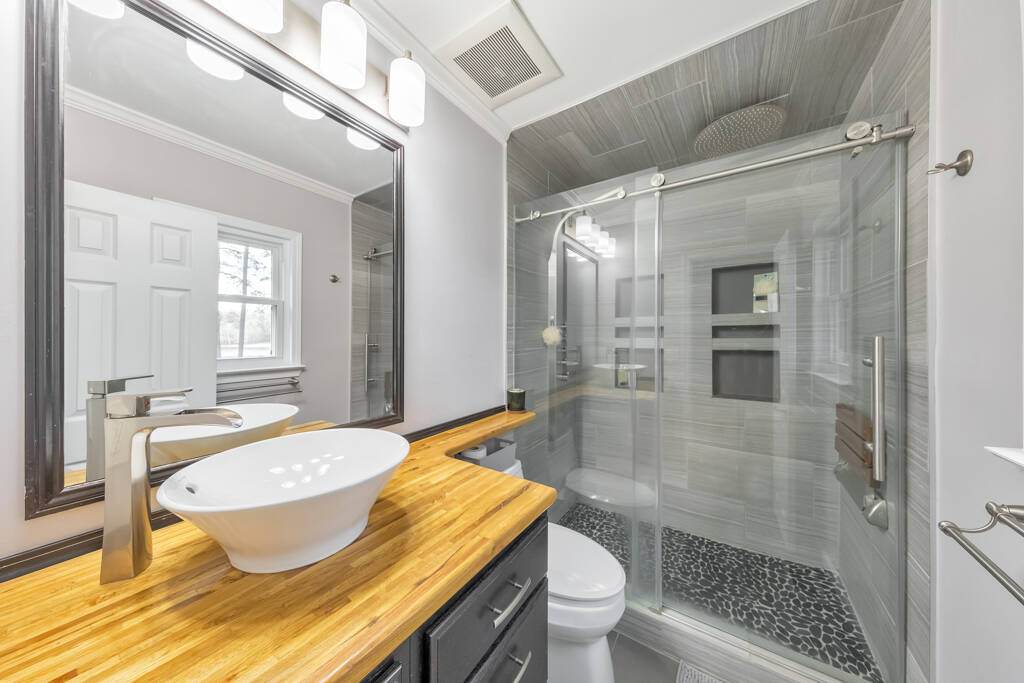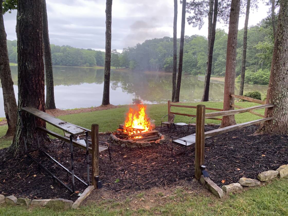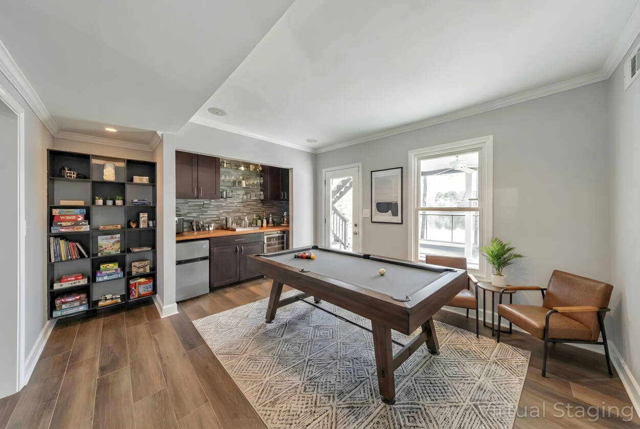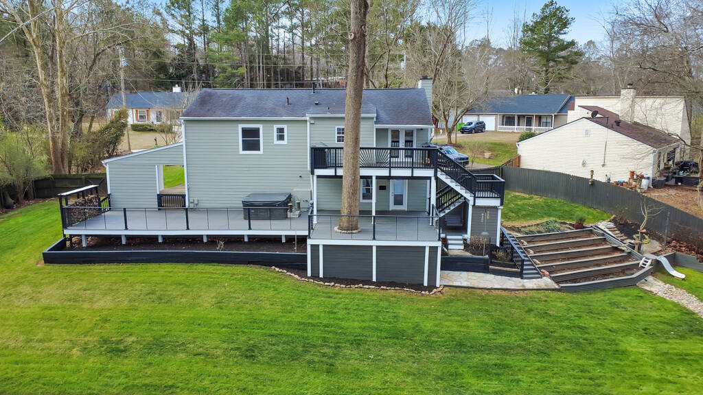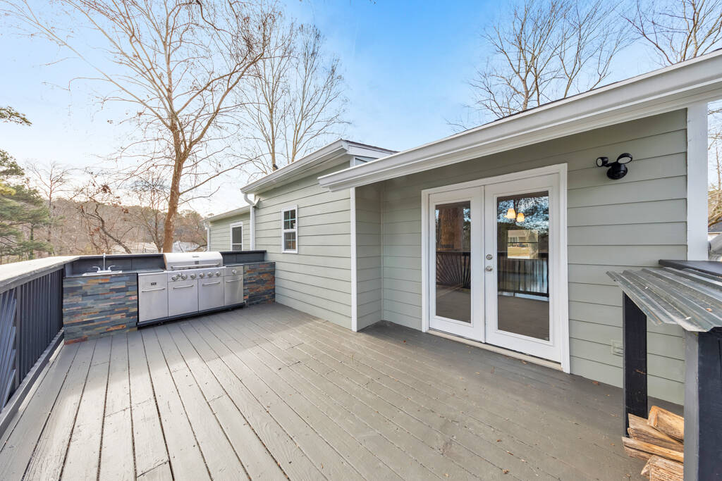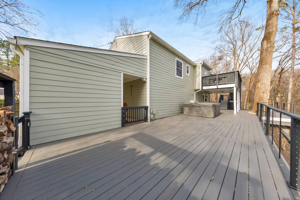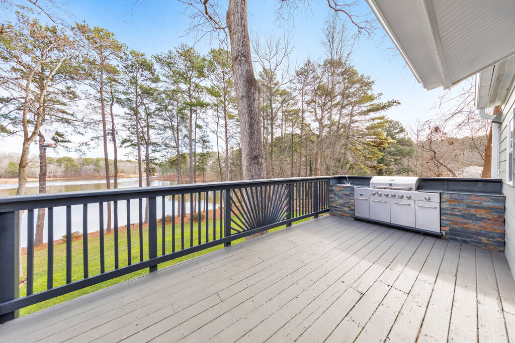 Welcome to one of the best views in Smyrna Vinings! Lakefront living meets exceptional upgrades in this meticulously maintained 4 bed / 2 bath home on a private 1-acre lot, perfectly located near Truist Park, first-class downtown dining, and just minutes to the Silver Comet Trail. Designed for both function and enjoyment, the property features a fully leveled, irrigated yard with raised garden beds with established fruit trees, berries, and herbs, a lakeside fire pit, and a playground! Outdoor living is elevated with an expansive deck featuring an under-deck system, built-in speakers, and a six-person hot tub, plus an upper deck with widened railings for entertaining and a built-in outdoor kitchen complete with sink, smoker, and gas grill. An attached third-car carport with additional attic storage offers flexible space ideal for boat or golf cart storage, a workshop, covered entertaining area, or future enclosure. Exterior upgrades include Hardie board siding, gutter guards, and multiple dry storage areas. The oversized two-car garage is enhanced with a generator hookup, custom cabinetry, shelving, rubber flooring, and Wi-Fi–enabled garage door openers and lighting. Inside, the open-concept living area features a fireside family room with surround sound and NuCore luxury vinyl plank flooring with cork backing for sound deadening throughout. The upgraded kitchen includes soft-close cabinetry, dual pantry options, premium LG gas range, LG refrigerator with Craft Ice, ultra quiet Bosch dishwasher, under-cabinet lighting, Keurig water hookup, designated pet or pantry cart space, and an in-wall iPad hub perfect for shared calendars and shopping lists. The main-level primary suite offers a spa-style bath with tiled, dual-headed rain shower and bidet, while two additional bedrooms and an upgraded hall bath complete the main level. The finished lower level includes a flex space or fourth bedroom, a recreation room with surround sound, and a stacked-stone dry bar with wine cooler and refrigerator, wired for home theater use. Major systems and efficiency upgrades include new interior paint, attic storage, spray-in and additional insulation, smart Wi-Fi features, automatic temperature-controlled ceiling fans, upgraded Panasonic bath exhaust fans, child-proof outlet covers, a tankless water heater, and a 2.5-ton Trane HVAC system. Thoughtfully improved with intention and care, this home mirrors the beauty of nature through warm earth tones, wood, and stone, delivering comfort, flexibility, and true move-in-ready lakefront living.