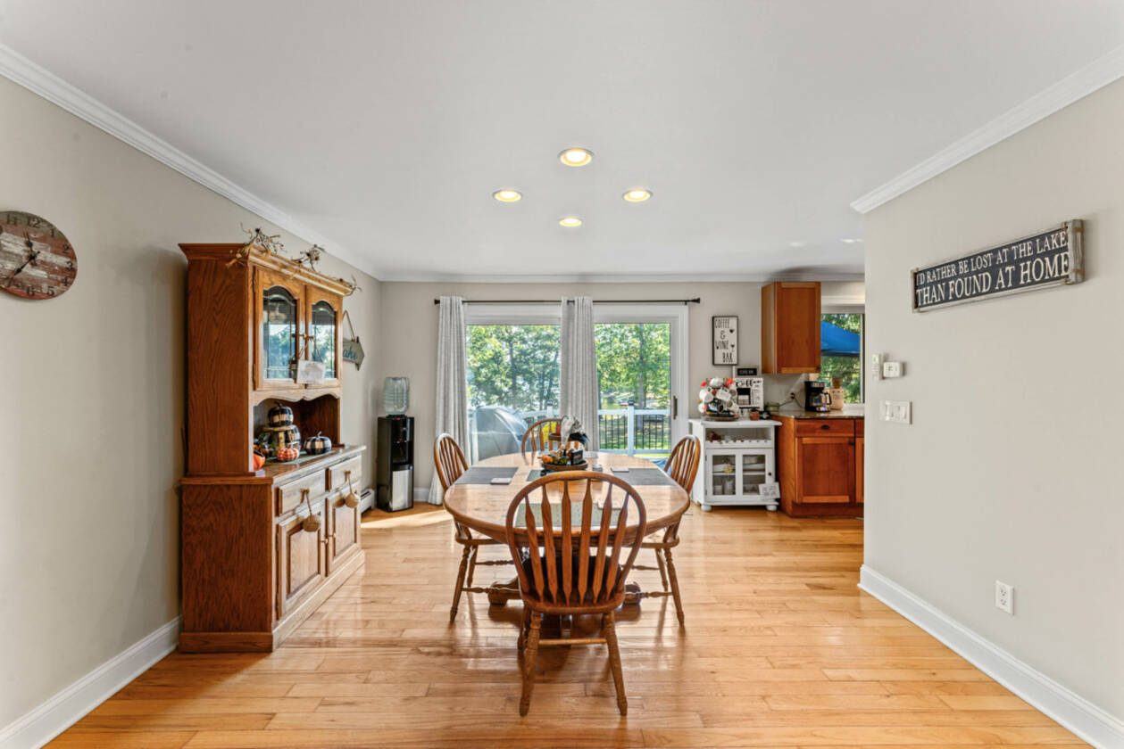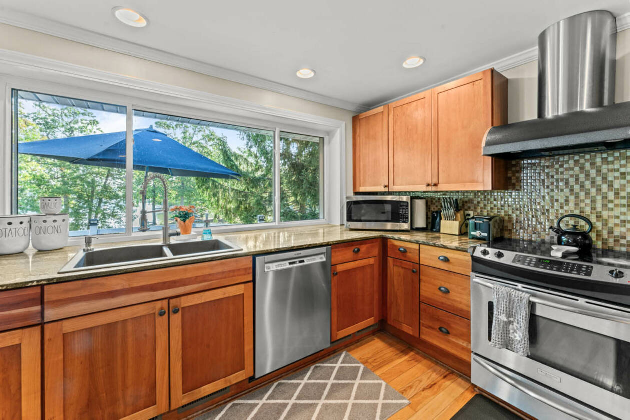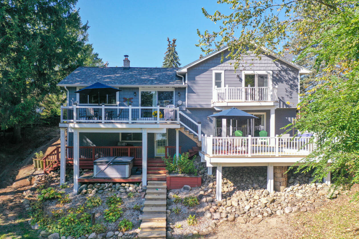 This is your perfect opportunity to snag yourself that waterfront home on private all sports Lake Shinanguag! Timing is key with enjoying the fall vibes and beautiful winter view all while making this home your own perfect entertaining oasis for the summer. Boasting over 2700 sq ft of finished space, this home offers panoramic lake views from all levels. The kitchen will not disappoint with many upgrades including top notch appliances, granite countertops and cherry cabinets; perfect for entertaining with its open concept to the dining and living room. The walkout basement ushers you out to one of 4 decks (3 of which were completely updated with new boards and railings), where you'll find a relaxing hot tub and your private 90 ft of water frontage. The basement also has an extra 5th bedroom or office space with its own private entrance. Updates include 1. New roof, gutters and sky light (2024) 2. New water softener (2024) 3. New boiler (2021) 4. New siding (2020) 5. Deck board and railing (2023-2025) 6. Split zone air conditioning/heat pump (2015) 7. New cement driveway (2019) 8. New well pump and tank (2024) 9. Sewer grinder pump for lower level bathroom (2024) and septic tank pumped (2024). So grab your family and move right in! This home is a must see and priced to sell. Located in the desirable Goodrich Community School District. Washer and Dryer not included in sale.