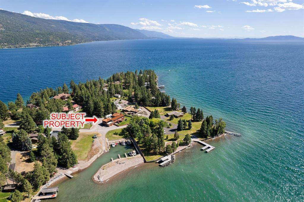 Experience the pinnacle of Montana lakefront living at Woods Bay Point, an exclusive gated community just moments from the quaint and lively town of Bigfork. This stunning 5-bedroom, 3-bathroom estate is perched on a secluded peninsula, offering unmatched vistas of Flathead Lake. Its design incorporates unique driftwood features, handpicked from the lake's shores, adding a touch of local artistry. Upon entering, you're welcomed into a living space that radiates warmth, centered around the fireplace. The room is crowned with vaulted ceilings and framed by expansive windows, seamlessly integrating the lake and mountain views into the home's ambiance. Designed for sophisticated entertaining, the residence boasts a sprawling deck that transitions effortlessly into a covered patio area. This social hub is equipped with an upscale outdoor bar, featuring barbecue grills, a popcorn maker, plush seating, and a shuffleboard table, promising unforgettable gatherings under the Montana sky.