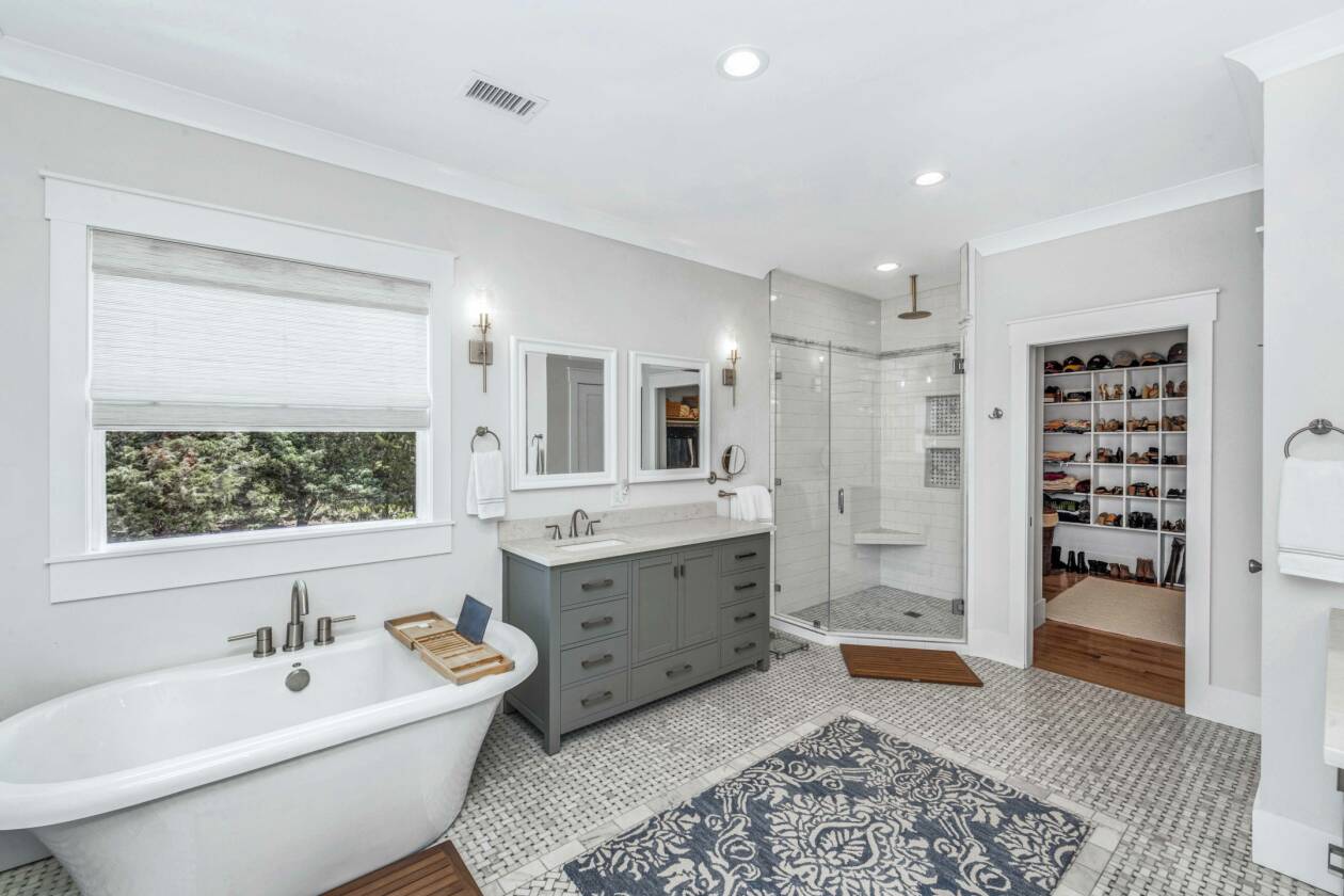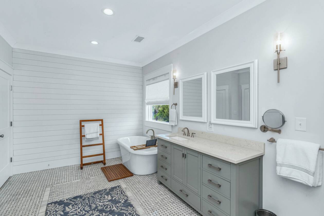 The primary suite is tucked at the back of the home, offering a spacious and quiet retreat with porch access and a spa-like bathroom complete with a soaking tub, walk-in shower, dual vanities, and an oversized custom walk-in closet. Bespoke details, including basket weave tile, coastal wallpaper accents, and a custom shiplap wall, set the bar for luxury in this thoughtfully designed space. A guest suite, large laundry, and powder room complete the main level.