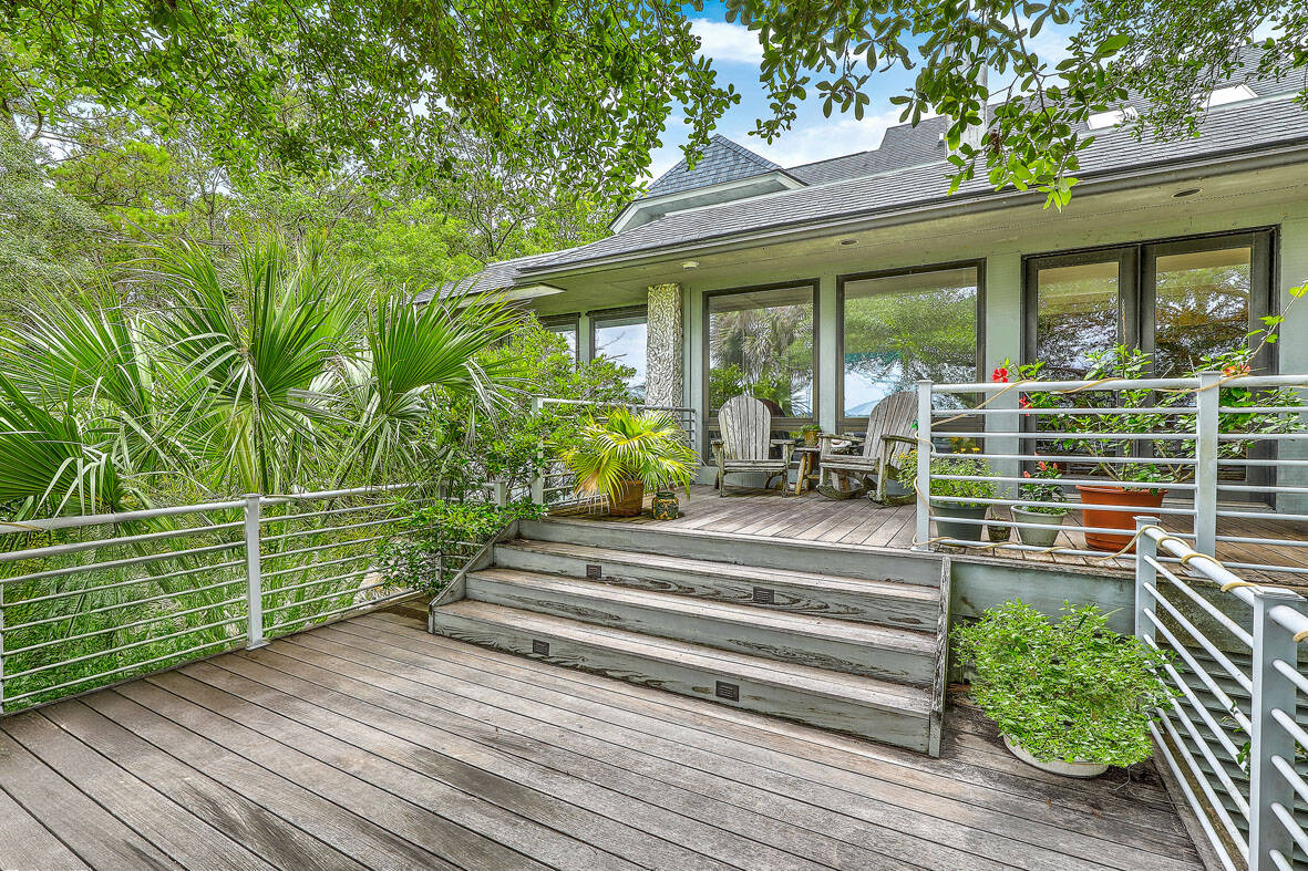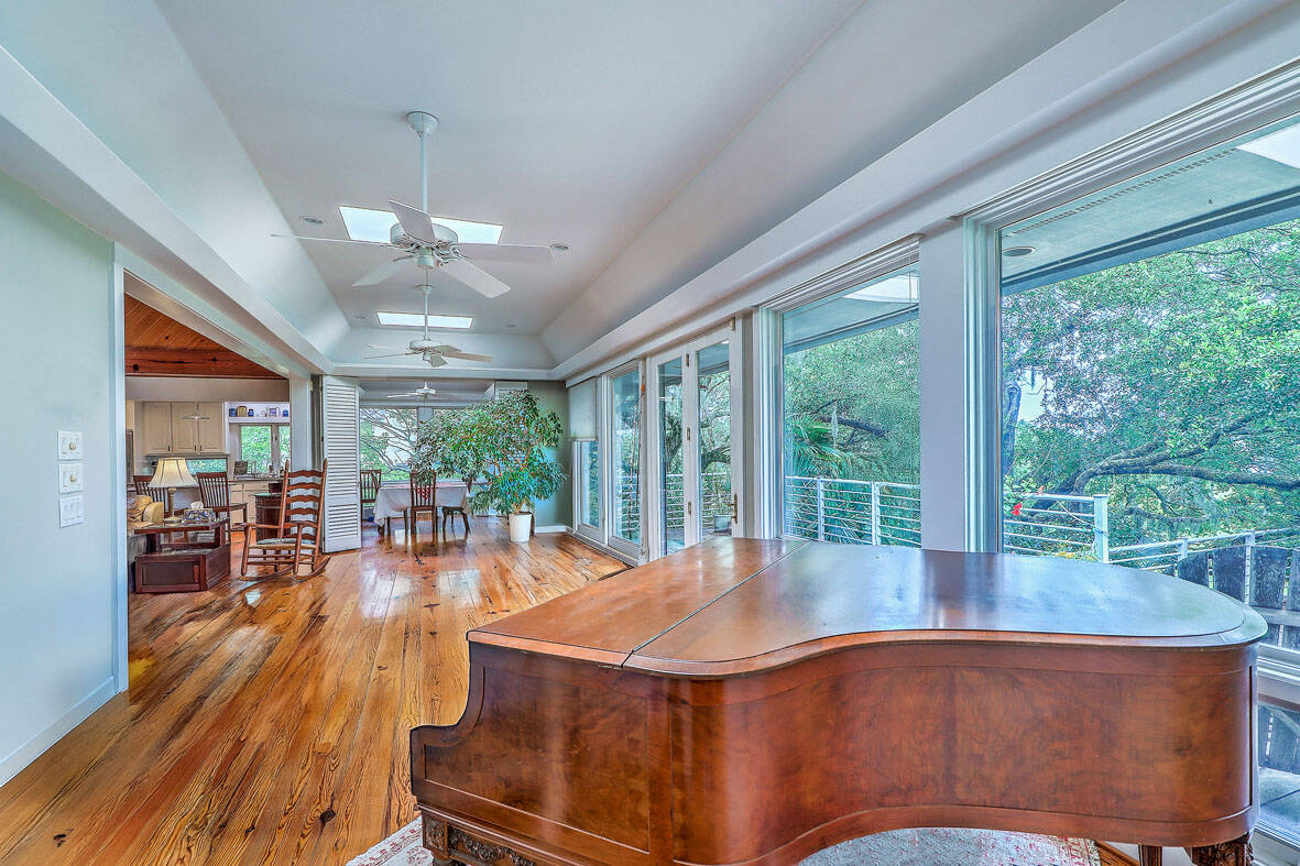 A large peninsula with breakfast bar overlooks the great room. A gas log fireplace with old Charleston bricks is the focal point of this space and draws the eye up to the vaulted, beamed ceiling. The kitchen is open to a casual dining room in back corner with windows and water views all around. A sunroom stretches the full width of the back of the property and opens to a deck that supports a hot tub.