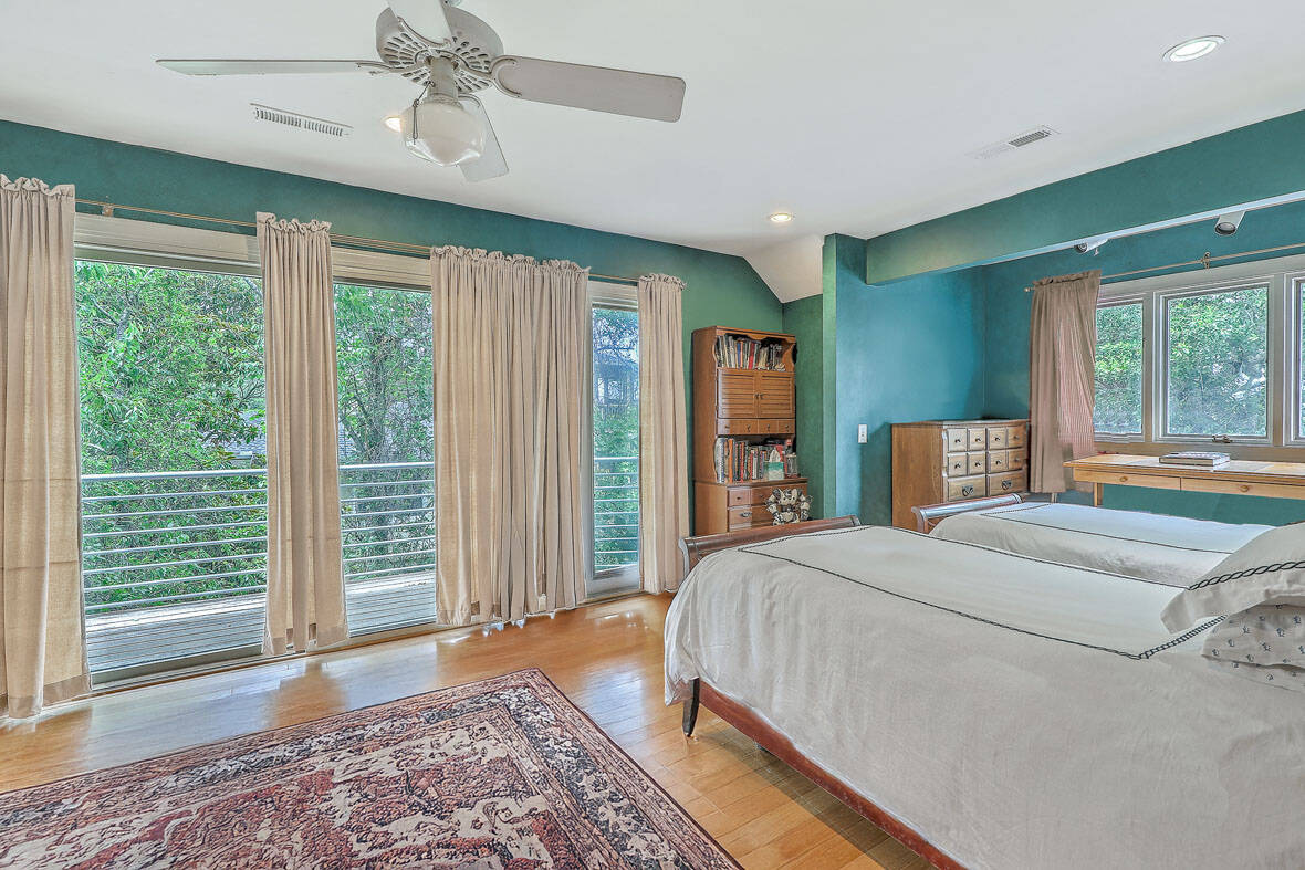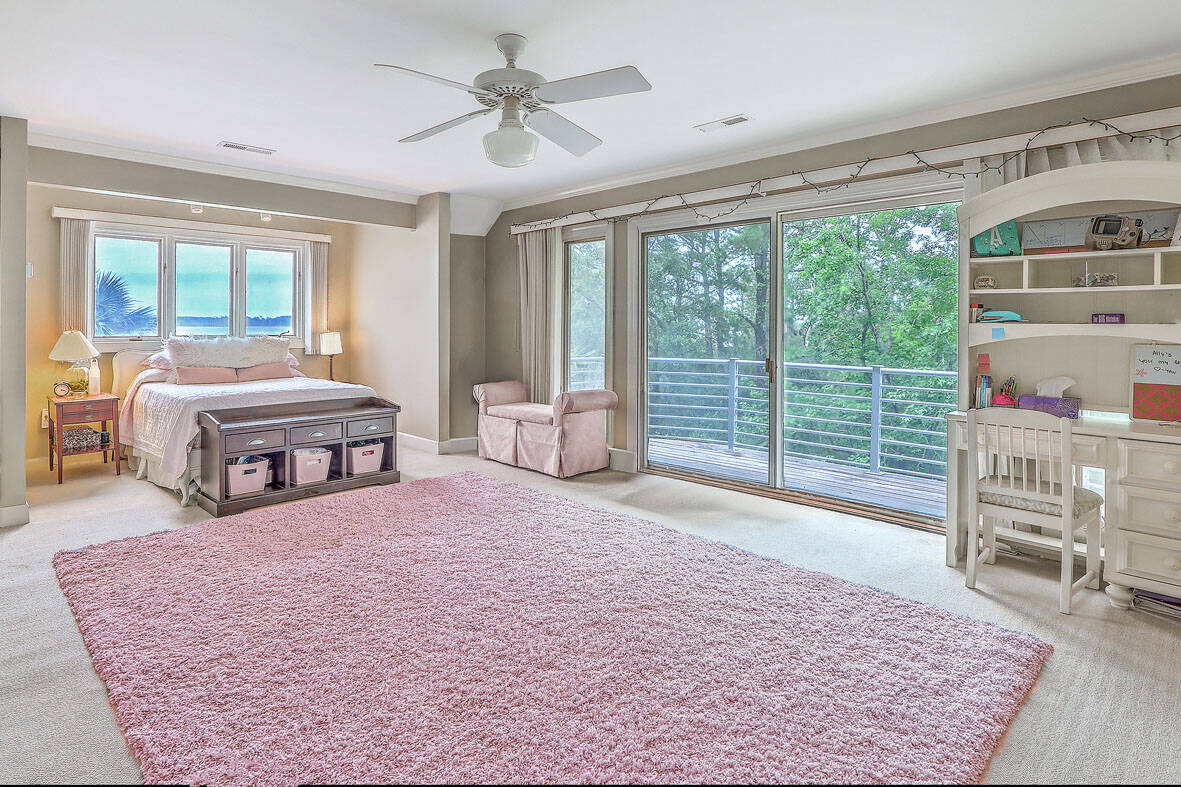 The primary suite is on the main level and occupies the other marshside back corner of the house. It includes his and hers walk-in closets, an en suite bath, and room for a sitting area or home office. There is also a second bedroom with attached hall bath on this floor. Upstairs are 2 spacious bedrooms each with an en suite bath and access to a balcony via sliding glass doors. One bedroom has a large walk-in closet and wall of built-in cabinetry for storage and display.