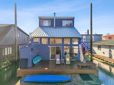 Welcome to ELOHEH! FABULOUS FLOATING FLIP!! If you're seeking a turnkey nicely renovated home / 2023', a near new float, and good quality fit and finish look no further! Want to make it simple? Can come fully furnished with all high end implements; furnishings negotiable. Step beyond the pier side privacy gate into your covered entry, and further on into the lap of luxury with nothing to do but unpack and enjoy! Float was rebuilt with oversized logs exceeding code requirements & new steel stringers. New swim float & low maint composite decking throughout. Detached fully finished artist's studio with wall heat adds flex space. Double door entry with mud room and full light entry door into the great room floor plan. Everything is next to new; Cali LVP flooring, lighting, millwork, fixtures, finishes, chrome hardware, and paint. Living room has river views to the SW and light abounds! Cozy dining nook open to the new kitchen with custom cabinetry boasting soft close hardware, plywood boxes, solid wood facing, and dovetail joinery. Granite slab countertops with custom tile backsplash, undermount stainless sink, & eat in bar. Energy star stainless appliances & Kohler Faucet. Primary bedroom has ceiling fan, walk in closet, & attached bath. Bathroom boasts HQ vanity with granite slab top, dual undermount sinks, tile backsplash, floor to ceiling tile shower, & glass sliding door. Second bath off kitchen just beyond stackable washer and dryer has similar finishes. 2nd bedroom is non-conforming / no closet and while a smaller space, can be configured as a bedroom, office, or? Ductless mini split for efficient heating and cooling, cadet heaters in bathrooms. Spot lighting, and a lengthy list of custom features. Slip ownership moorage with low dues / $480 includes water, sewer, garbage, commons maint, & management. Don't miss the extra wide river space rear; one of the widest of all finger rows in the moorage! Channel views, exceptional sun exposure, and a true quality gem!