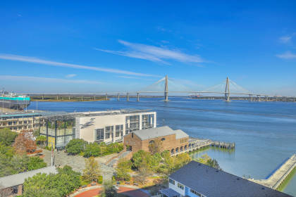 Enjoy views of Charleston Harbor and the Ravenel Bridge from this 2 bedroom, 2 bath corner unit condominium for sale. Dockside 12C features 2 balconies, one with water views and the other with sweeping city views overlooking Gadsdenborough Park. The condo has parquet floors as well as some upgrades to the kitchen and baths. The primary bedroom has an en suite bath and 2 closets, including a walk-in. The second bedroom currently has built-in cabinets for use as an office or den. Both bedrooms access a balcony that overlooks Aquarium Wharf park and the Cooper River beyond. Dockside is conveniently located near the South Carolina Aquarium and Fort Sumter boat tours. Amenities include 24-hour security, lobby, club room, library, heated pool and fitness center. Waterfront Walk takes you to a deepwater boat dock facility for residents.