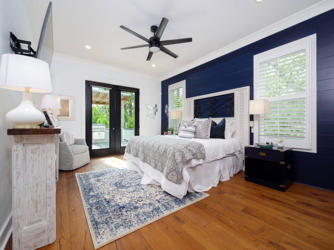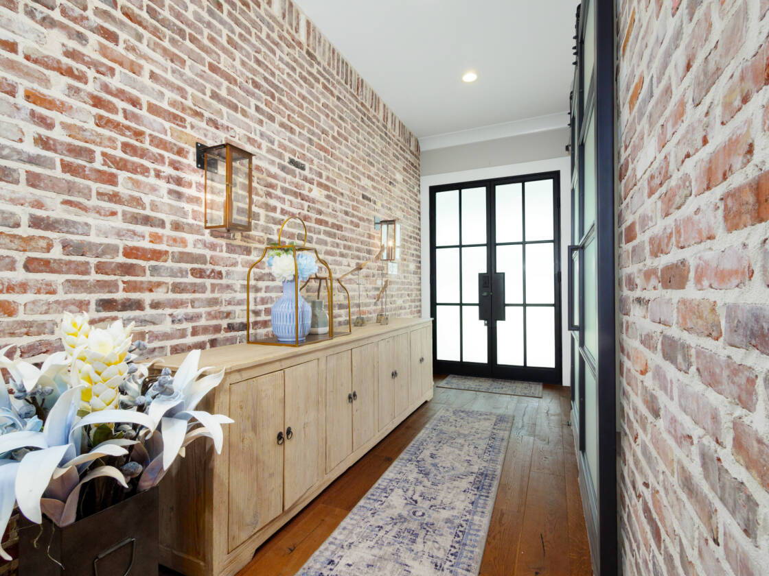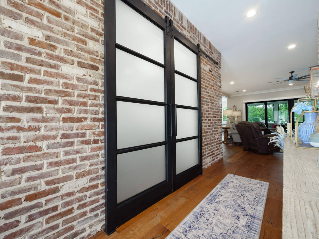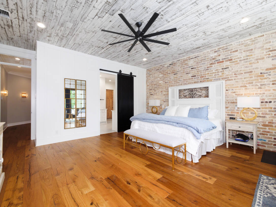 - Primary ensuite has sitting area, custom wood ceiling, barn door to bath, reclaimed brick feature wall, overlooks pool and bayou