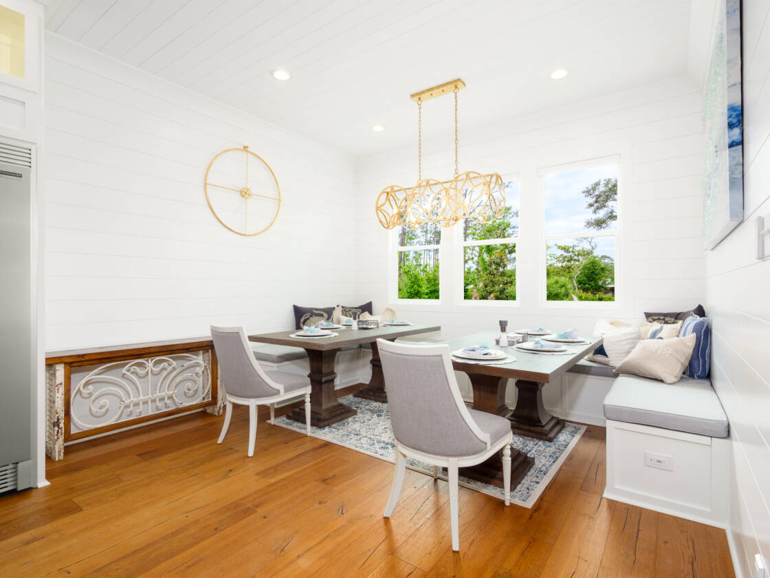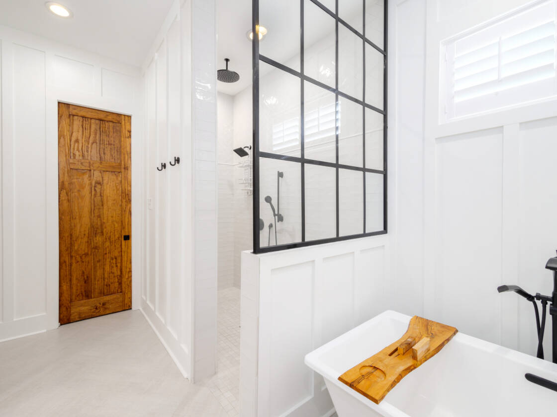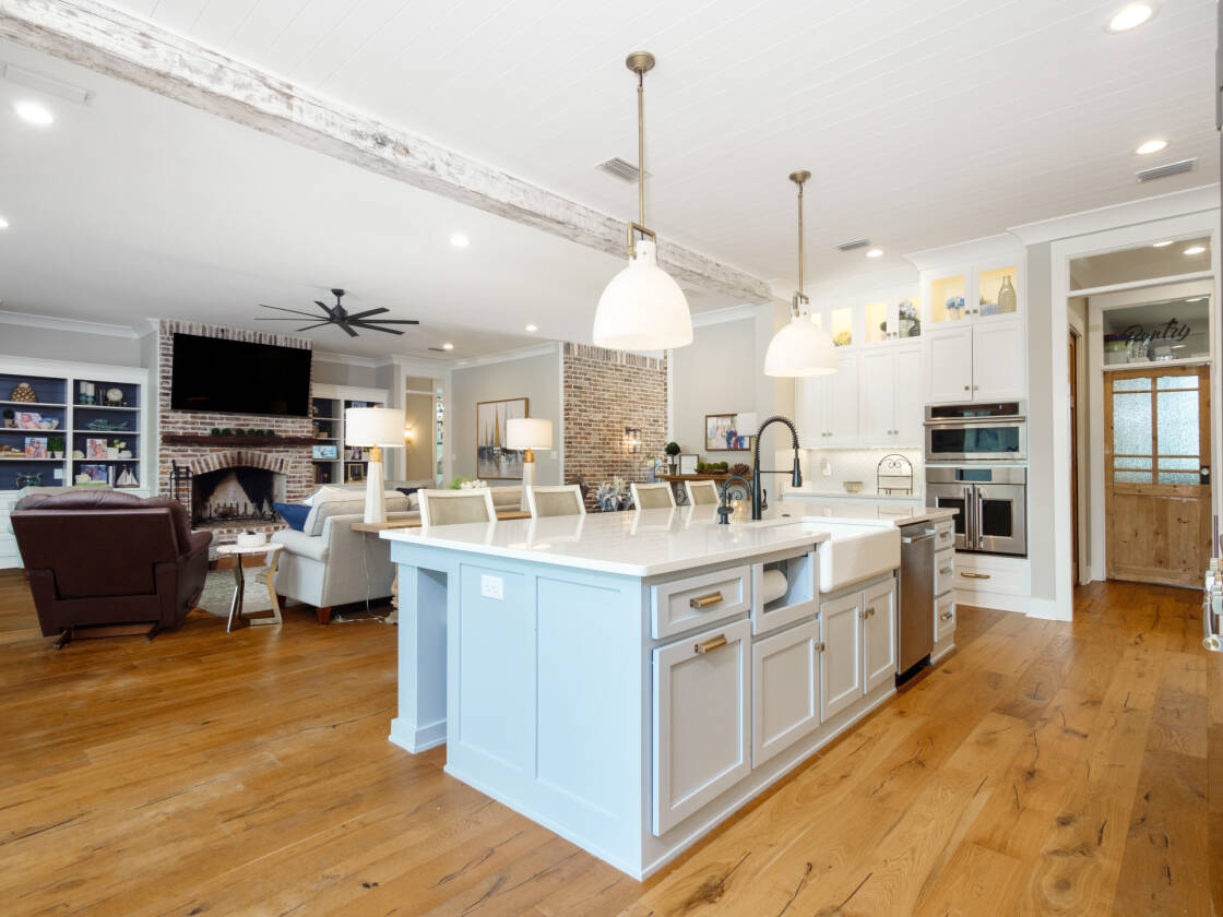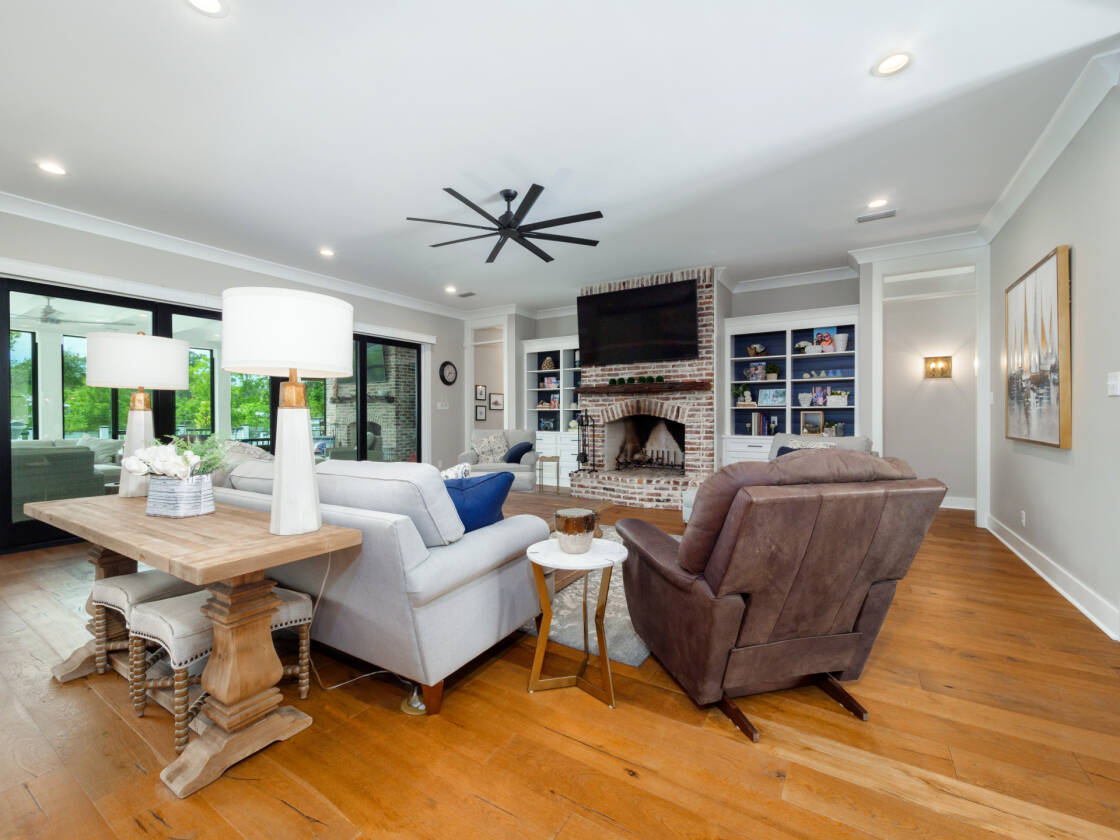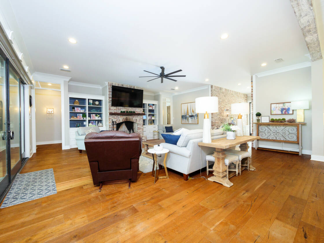 - Primary ensuite has sitting area, custom wood ceiling, barn door to bath, reclaimed brick feature wall, overlooks pool and bayou