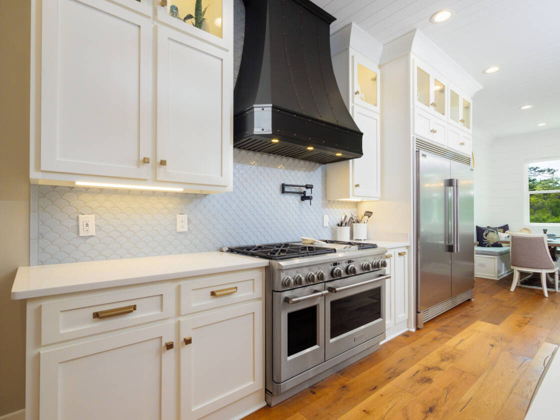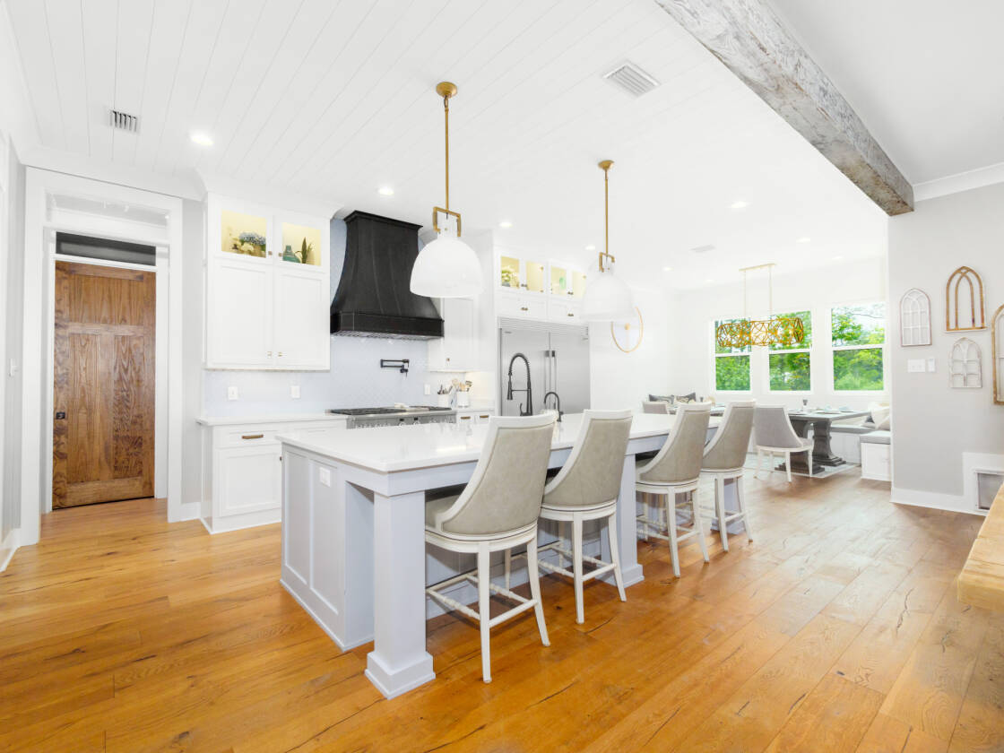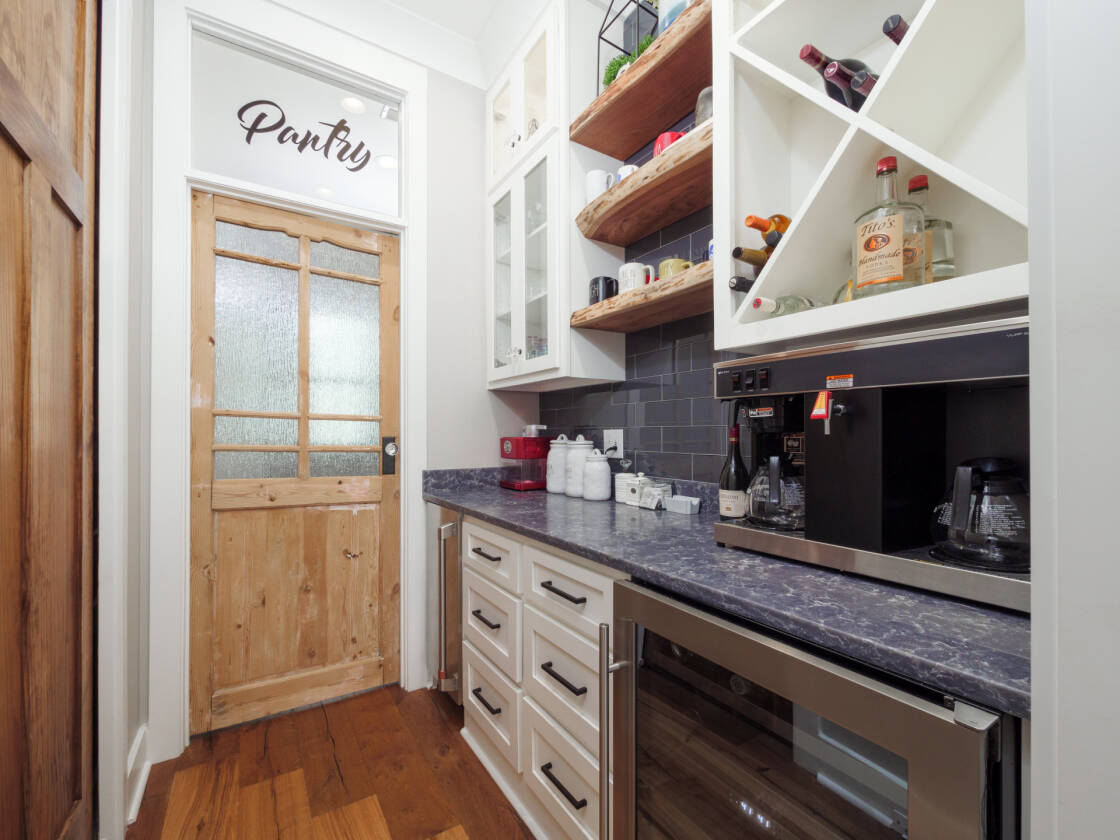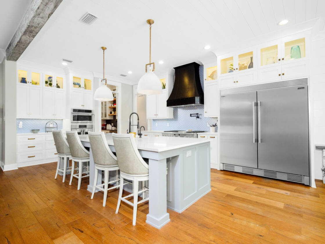 - Kitchen has custom cabinets, quartz countertops, cast iron sink, stainless steel upgraded appliances, gas range, custom built/designed hood vent, full size fridge and freezer side by side