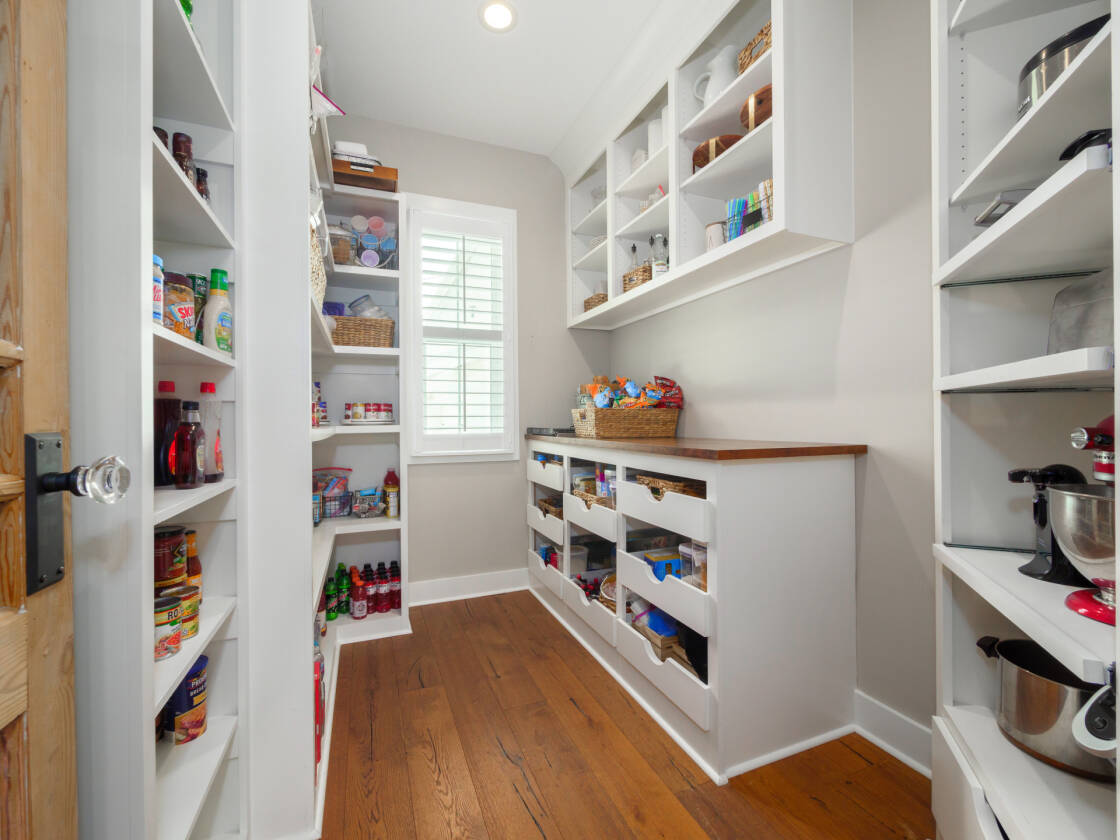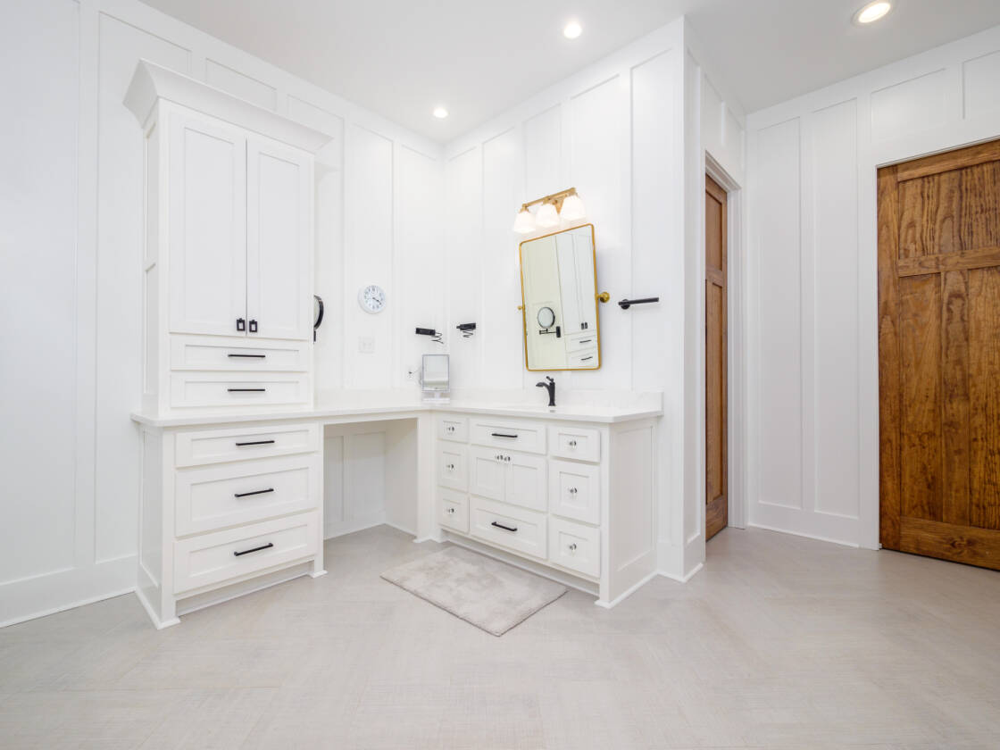 - Dual primary walk in closets, one with tons of shelving and built in shoe shelving and has built in dressers, the other has custom shelving, a desk, ironing/folding state, built in dressers