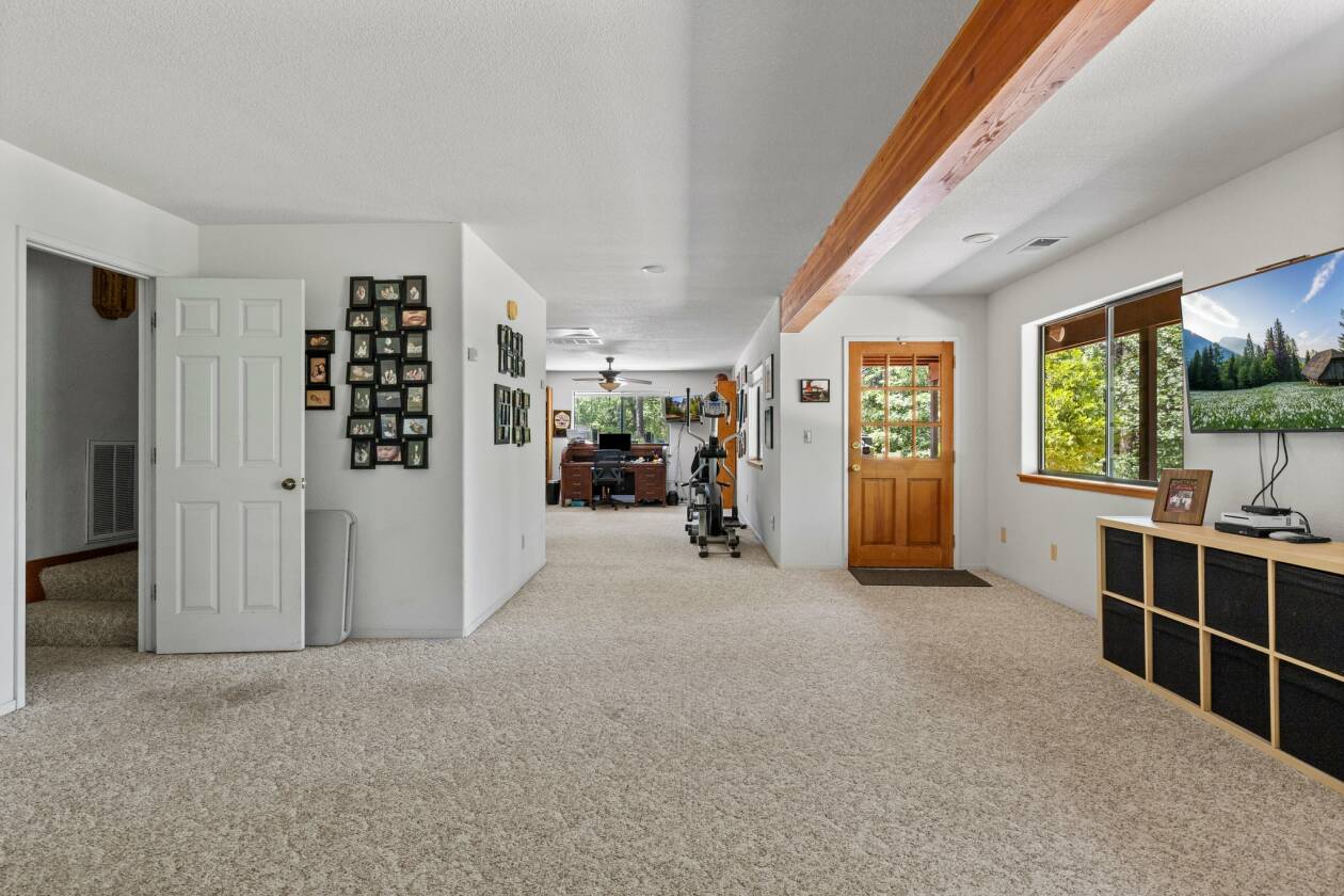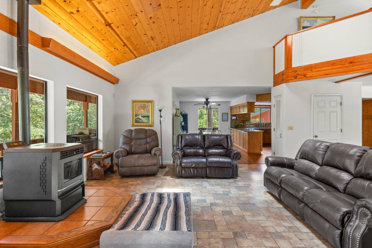 Lake House Dream! Welcome to your mountain escape in the exclusive Miner's Lake HOA. A quiet community of just a few homes sharing access to a private, amenity-rich lake. Enjoy 20 acres of outdoor recreation, including two private docks, a large BBQ area with picnic tables, and a lake stocked with largemouth bass perfect for swimming, kayaking, and fishing. The home itself is spacious and inviting, featuring vaulted wood-clad ceilings, abundant natural light, and a full wrap-around porch for year-round enjoyment. The main level offers a formal entry, a large living room, a primary suite, an additional bedroom, and a conveniently located kitchen with generous cabinetry and adjacent laundry. The lower level has a bedroom, bathroom, and a multi-use open area. Upstairs, a bright open loft includes its own private balcony where you'll enjoy breathtaking sunset views you'll never grow tired of. Plus, a whole-house Generac propane generator keeps things running smoothly no matter the weather. Bring your critters too! Livestock are welcome, with a charming red stable and small pasture ready to go. Whether you're looking for a full-time residence or a mountain getaway, this is a rare opportunity to enjoy comfort, beauty, and lake life all in one place!
