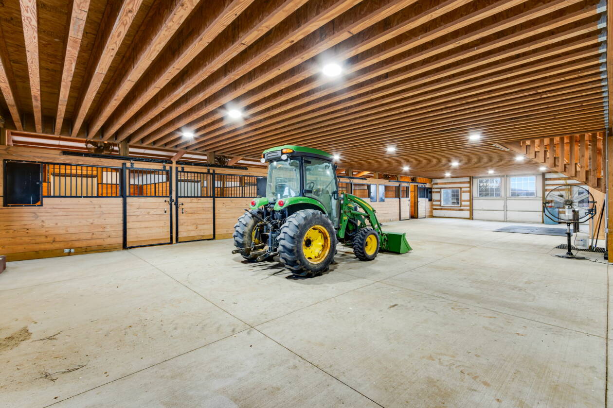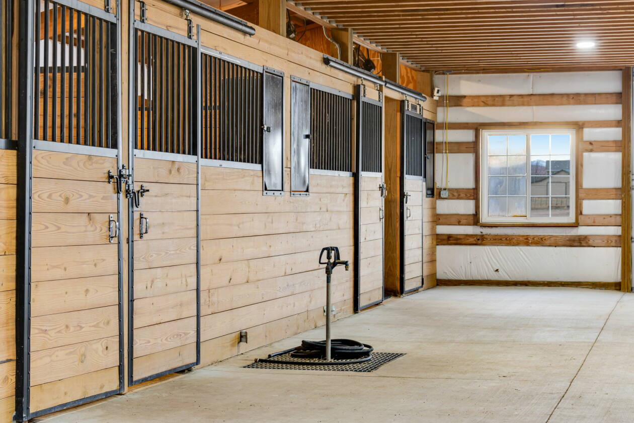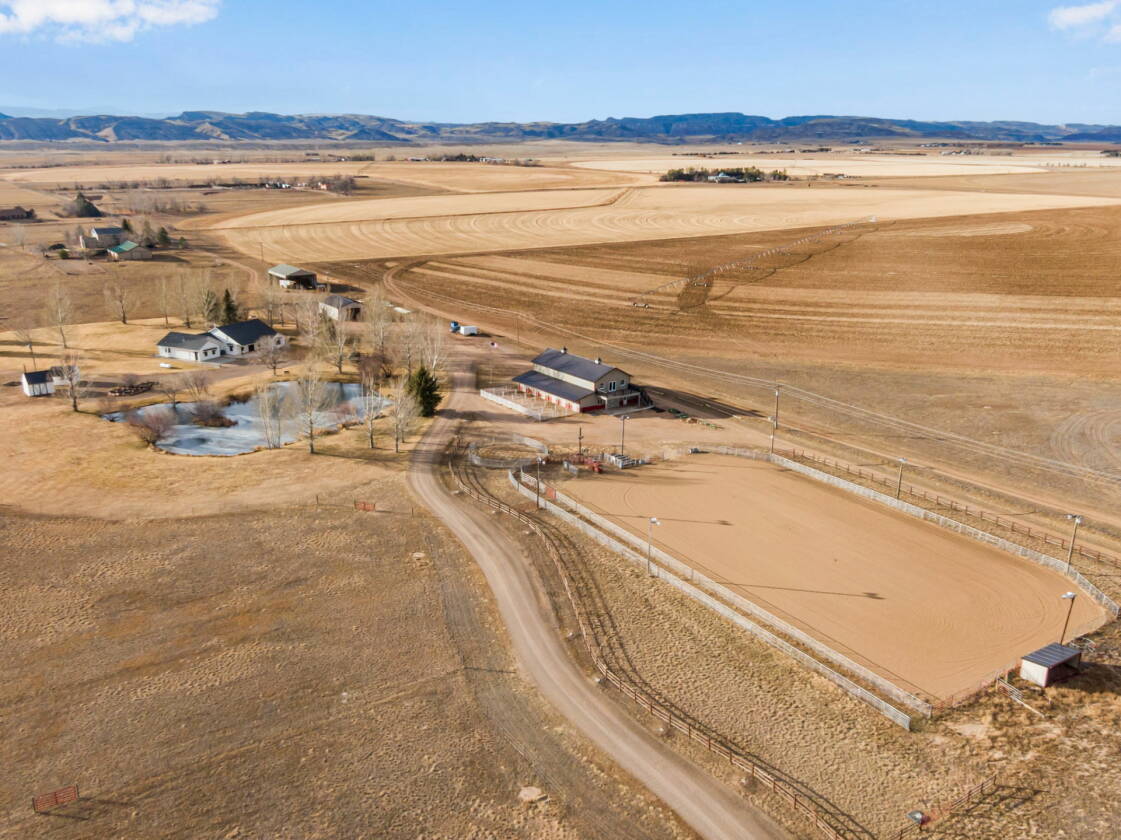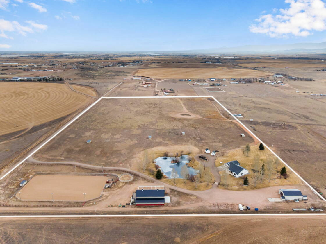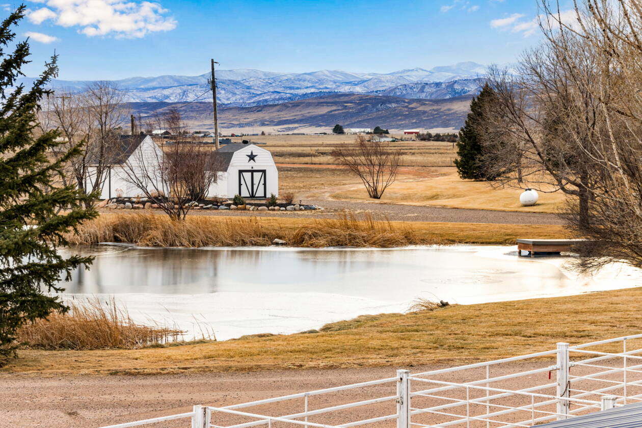 Exceptional, fully updated equestrian estate on 35.669 acres w/ NO HOA, NO METRO TAX & open zoning. Originally built in 1998 & extensively remodeled in 2023, offering privacy, functionality, & panoramic Rocky Mountain views. This rare property features a stocked pond w/ bass, dock, & sitting areas; 4 fenced pastures; 5 loafing sheds; round pen; 240' x 137' lite riding arena; pump shed; 3 storage sheds; & 8 exterior water hydrants, all accessed by a private driveway set back a .5 miles from the county road for privacy. Equestrian amenities are anchored by a 3,888 sq ft barn featuring 6 stalls each w/ private runs, tack room, wash bay, hay storage, a 2,232 sq ft loft, main-level concrete patio, & upper-level observation deck. A 1,545 sq ft detached drive-through RV/boat garage & shop features 220V, added electrical, air compressor, & included shelving, cabinets, & workbench. The park-like setting includes mature landscaping, sprinkler & drip systems, wood-burning fire-pit, horseshoe pits, expansive east-facing patios for sunrise views, & west-facing covered & uncovered patios w/ ceiling fan overlooking nightly Rocky Mountain sunsets. The primary residence showcases a split floor plan, front office, formal dining, white trim, new windows & doors, upgraded lighting, new paint & carpet. The chef's kitchen features a large island, quartz countertops, SS appliances, 6-burner gas range, commercial hood, double ovens, warming drawer & a walk-in pantry. Living spaces include a family room w/ wood-burning fireplace, oversized bedrooms including a private guest en-suite, 2 beds w/ a Jack-and-Jill bath, & a luxurious primary bedroom w/ retreat featuring a 5-pc. bath, & two walk-in closets. Home also features a massive laundry room designed for everyday efficiency & includes a mini refrigerator & ice-maker.