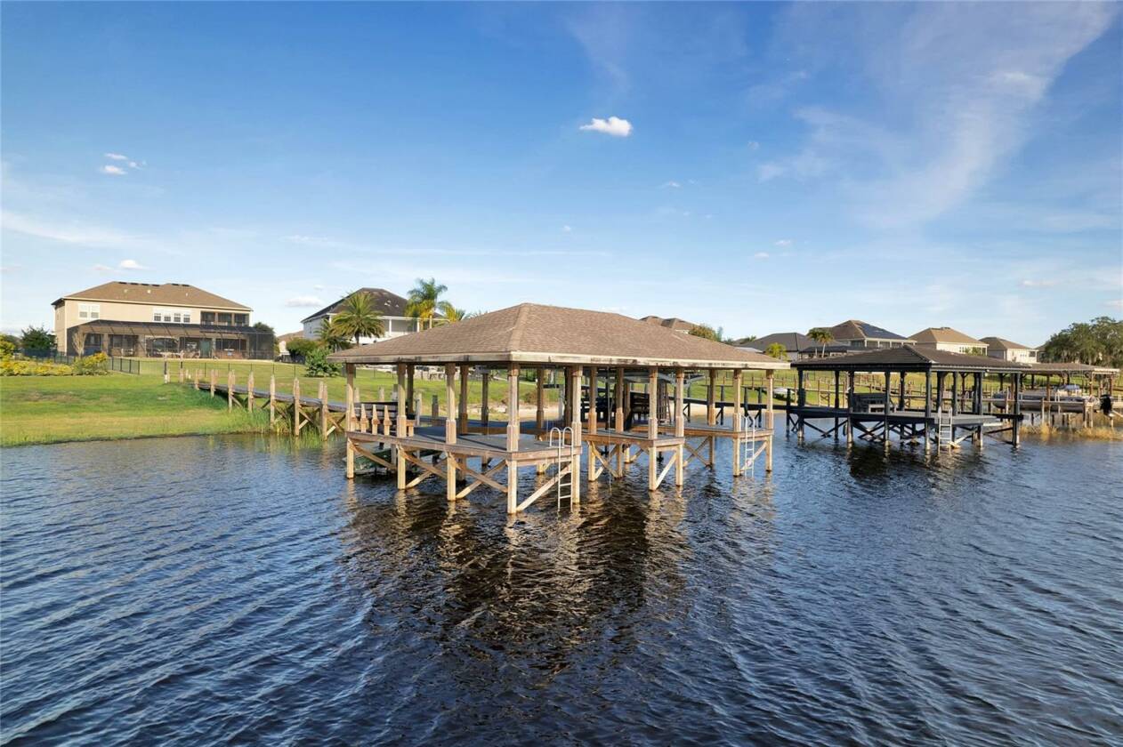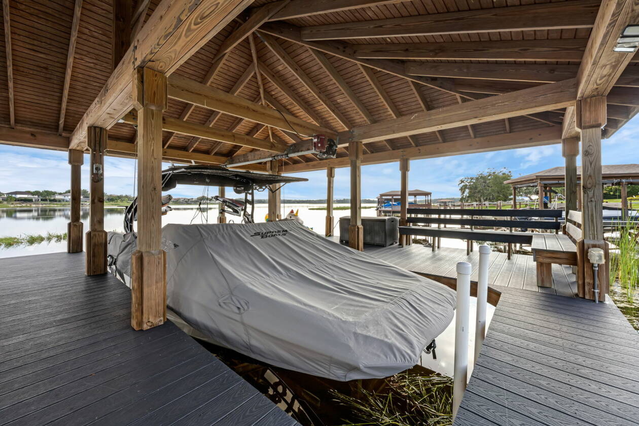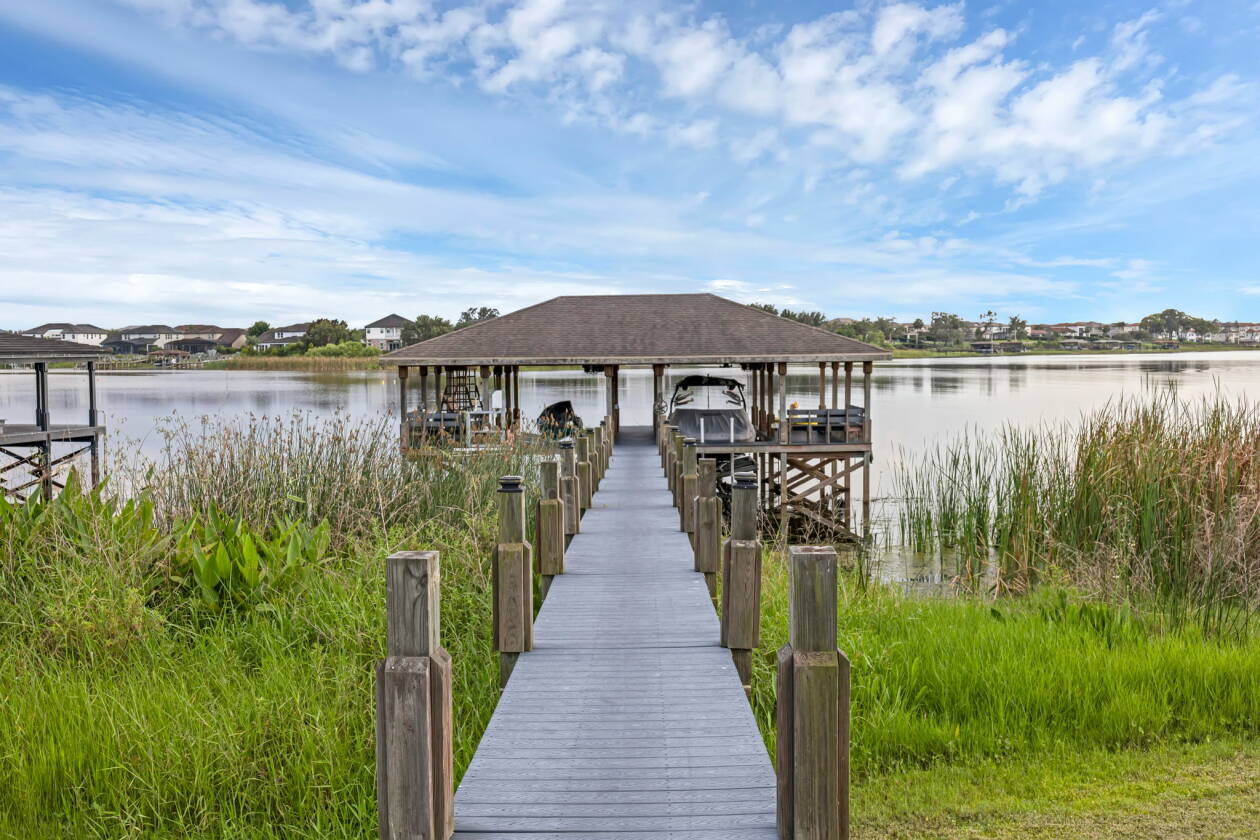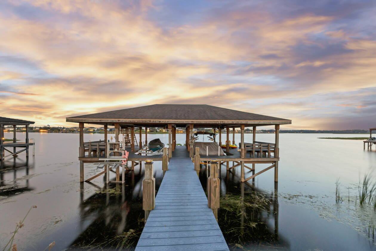 Stunning Lakefront Estate with Pool and Dock in Gated Hickory Hammock. This is a rare opportunity to own a luxury residence on Johns Lake, located in vibrant Winter Garden. This beautifully appointed Lewiston floor plan offers five bedrooms, four full bathrooms, two half baths, and a host of refined upgrades throughout—perfectly blending elegance, comfort, and Florida outdoor living. From the moment you enter, you’re welcomed by a dramatic two-story foyer with 20-foot ceilings, a striking grand staircase, and an elegant powder room. Just off the entryway, a flexible space can serve as a formal dining room, living room, or home office to suit your lifestyle. At the center of the home is an impressive chef’s (super) kitchen, designed for both entertaining and everyday living. It features two large, wood-wrapped islands—one with a sink and one with counter seating—quartz countertops, white cabinetry with custom drawer storage, frosted glass accent doors, a stylish backsplash, and a double oven (including convection). The electric cooktop, walk-in pantry, sunlit dinette, and included appliances make this kitchen as functional as it is beautiful. The open-concept family room flows seamlessly to the outdoors through triple sliding glass doors. Step outside into your private retreat featuring a fully fenced backyard, resort-style saltwater pool with lap lane, 10-foot depth, and sun shelf—all surrounded by lush landscaping. Just beyond, follow a grassy path to your private boat dock, complete with electric, water, 7,500-pound lift, Trex walkway, ladder, and seating area. It's the perfect place to relax and enjoy the breathtaking sunsets and nightly Disney fireworks over Johns Lake. The thoughtful layout includes a first-floor in-law suite with a private entrance, full ensuite bath with walk-in shower, walk-in closet, and screened patio—ideal for guests or multigenerational living. Upstairs, the spacious primary suite offers panoramic lake views through a wall of windows, tray ceilings, and French doors that open to a private balcony overlooking the pool, backyard, and waterfront. The luxurious ensuite bathroom includes two vanities, a garden tub, large walk-in shower, and generous closet space. Three additional upstairs bedrooms include one with a private bath and two that share a Jack-and-Jill bathroom. A large laundry room with lower cabinets and sink adds convenience, while the spacious flex room facing the lake is perfect for a game room, media space, or home office. The home features 10-foot ceilings on the first floor, 9-foot ceilings upstairs, engineered hardwood flooring throughout, smart fans, fresh exterior paint completed in 2025, and a split three-car garage offering excellent storage for recreational gear, vehicles, or water toys. Located within one of Winter Garden’s premier gated communities, residents enjoy access to a resort-style pool, fitness center, clubhouse, tennis and volleyball courts, dog park, playground, fishing pier, and scenic walking trails. Zoned for top-rated schools and ideally situated near Winter Garden Village, downtown Winter Garden, major highways, and just 15 miles from Orlando’s world-class attractions, this exceptional lakefront home truly offers it all. Now available and ready for immediate occupancy—this is your opportunity to enjoy the ultimate Florida lifestyle. Contact the listing agent to schedule your private showing today.