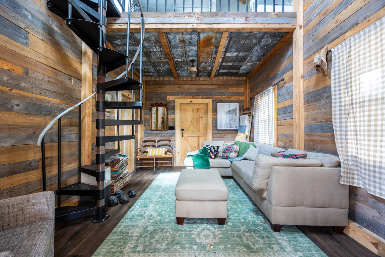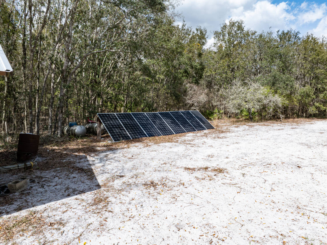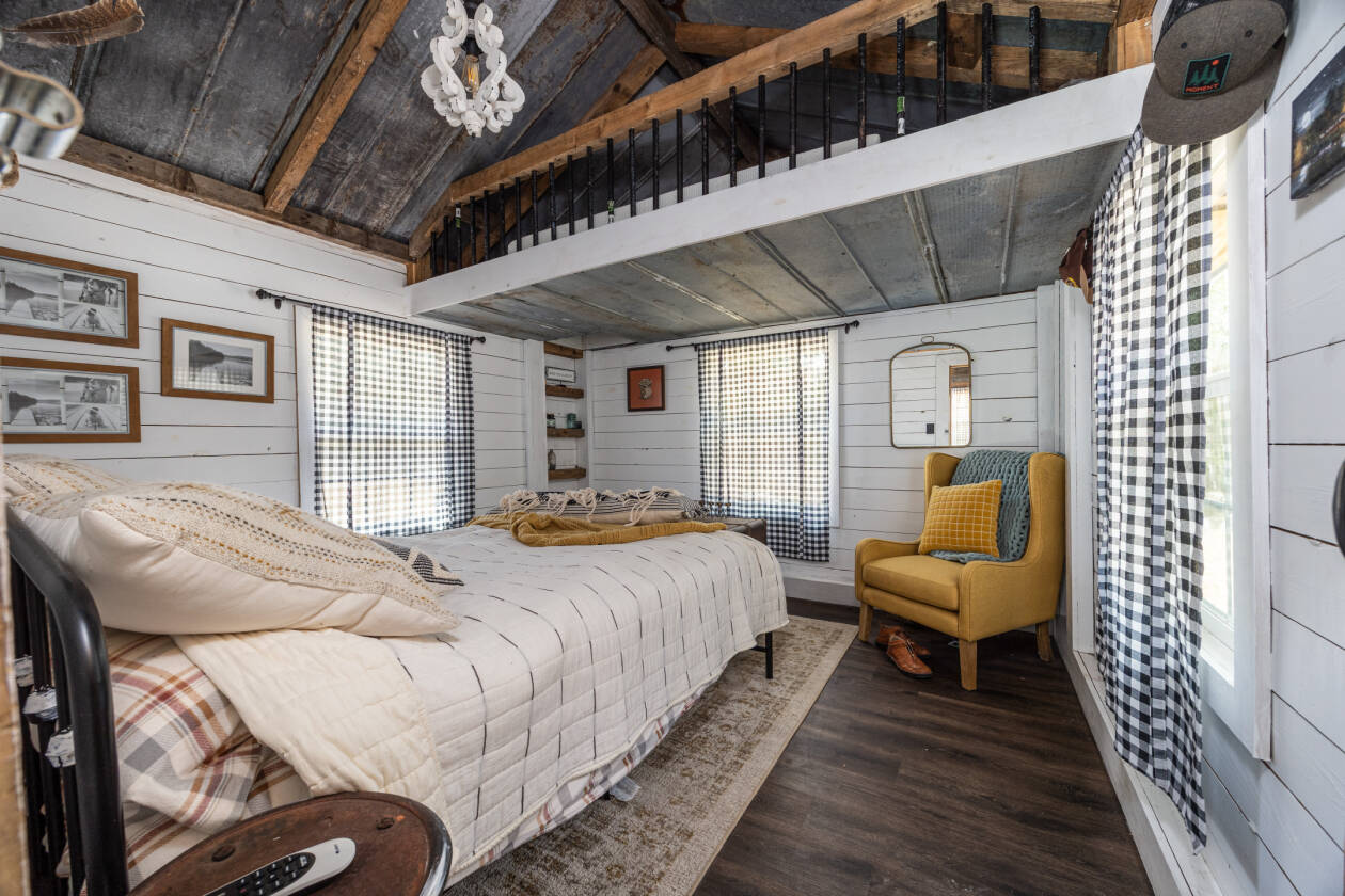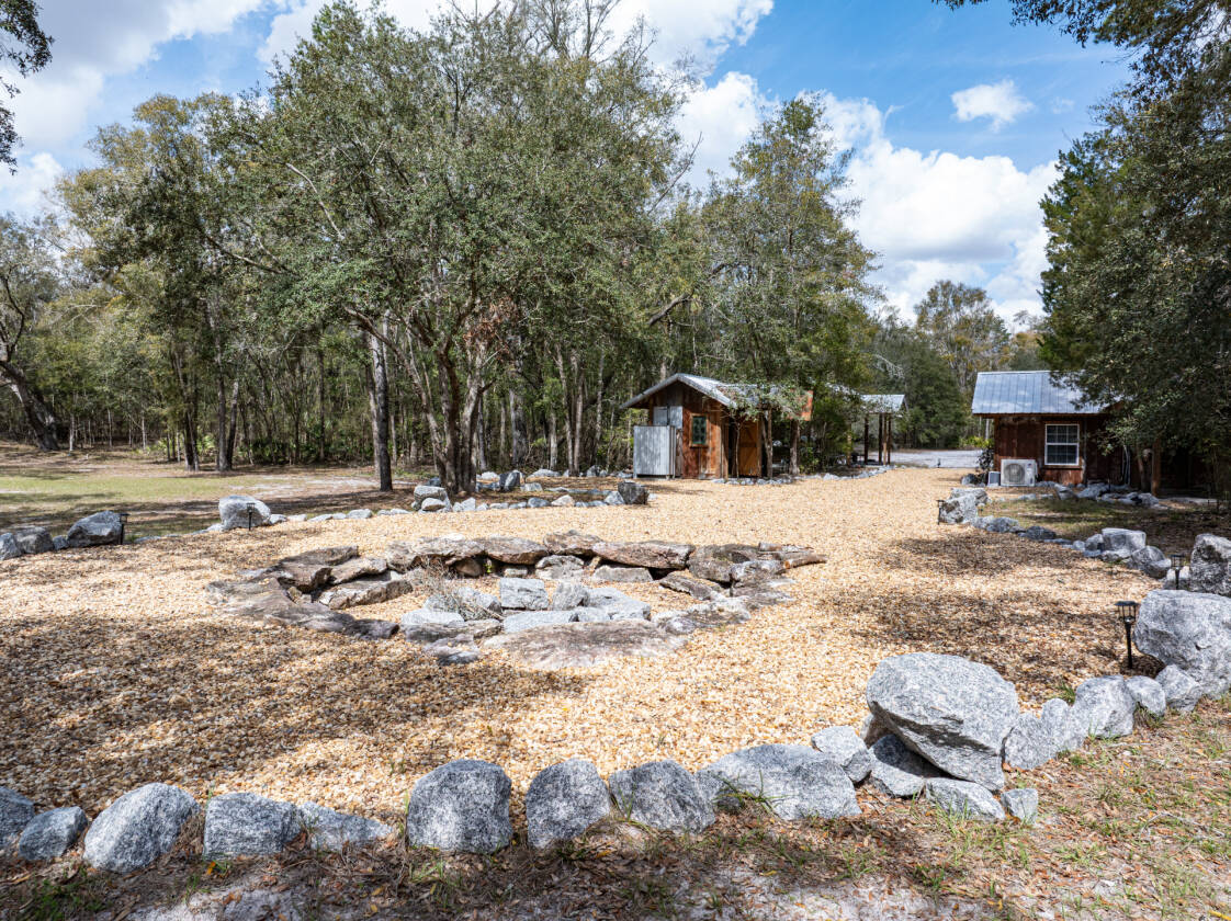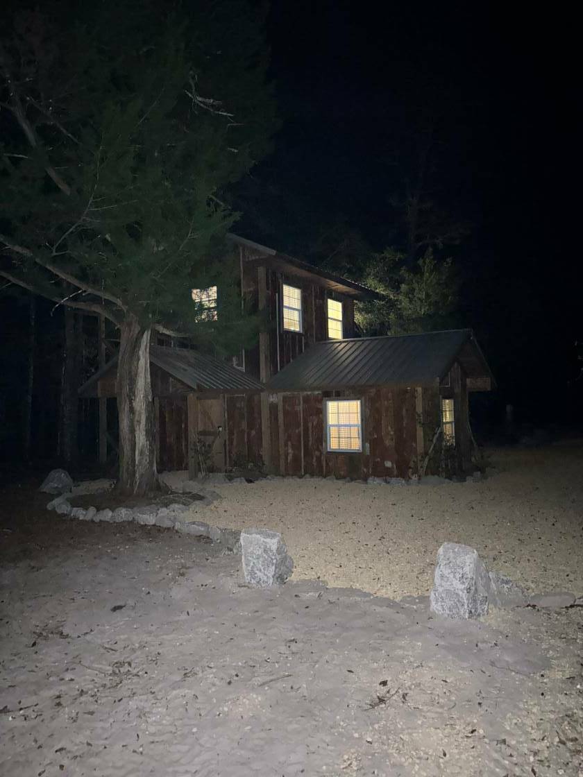 • The two story cabin is rustic in appearance and glamorous in comfort. Features include split unit air conditioning, television, covered porches, primary bedroom downstairs with sleeping loft upstairs. Covered porches front, back and side and a balcony! The detached bathroom is complete with shower inside and out. This home is off-grid with powered via solar and diesel generator. Enjoy evenings around the large fire pit, steps from the cabin and surrounded by natural rock seating.