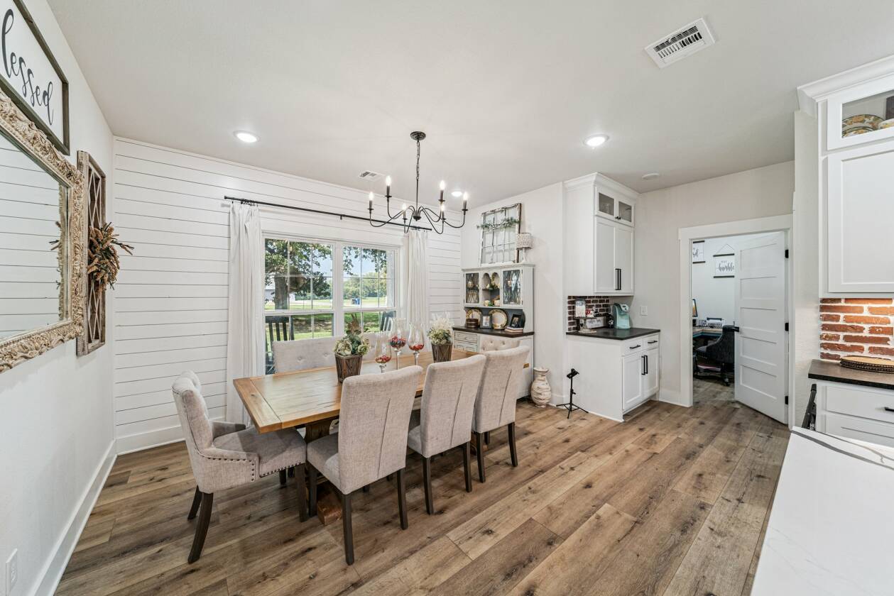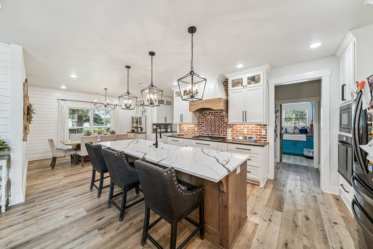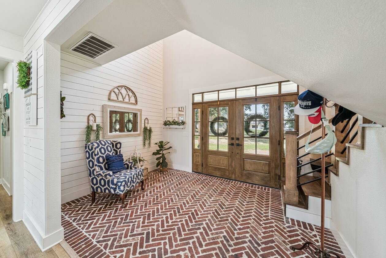 • Stunning brick floors, shiplap walls, and 17’ stained ceilings