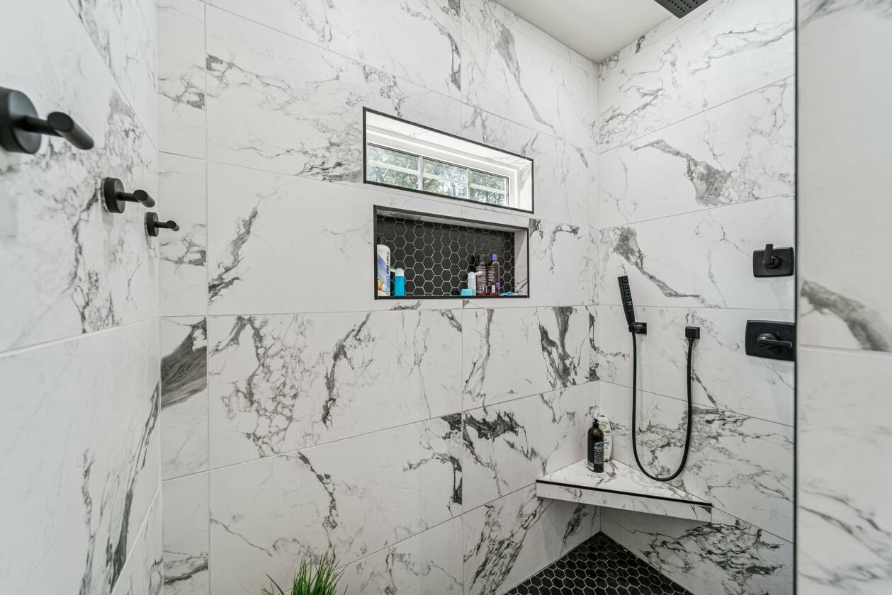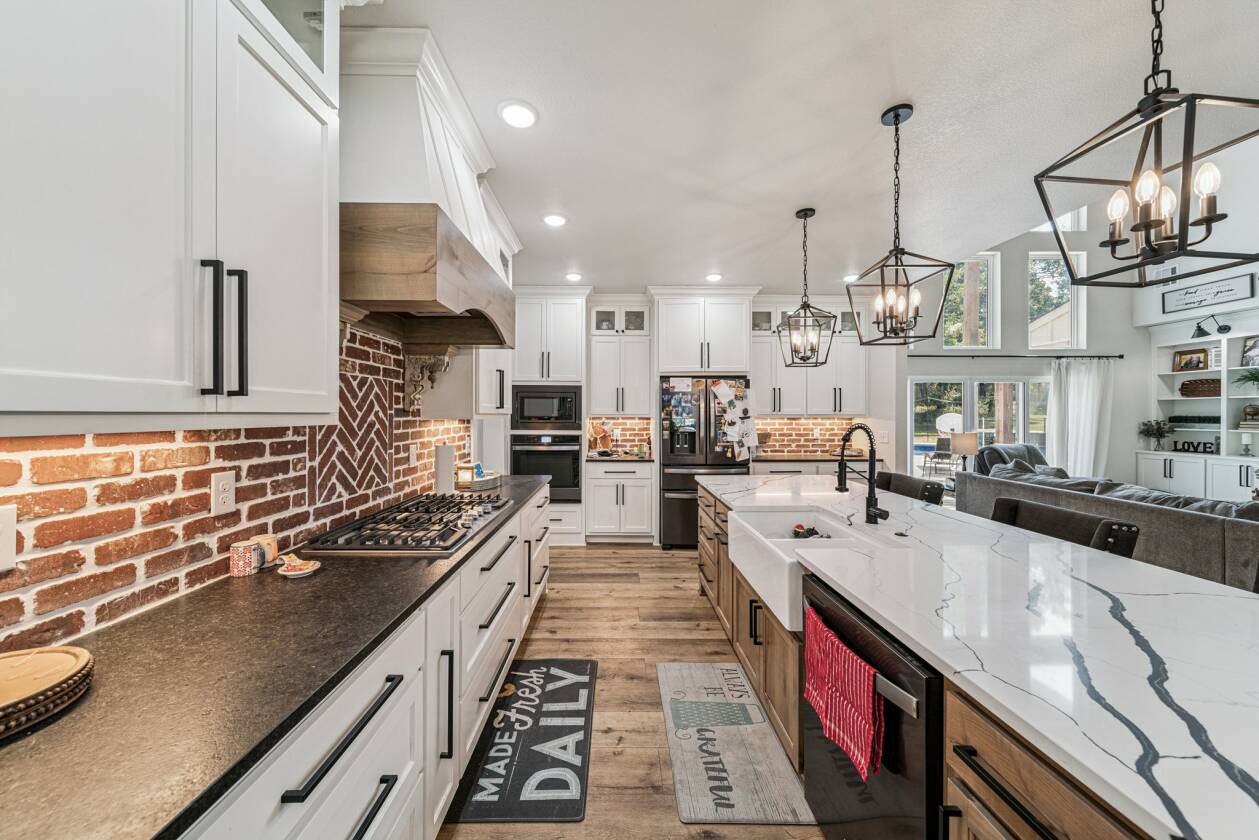 • Open-concept kitchen with quartz countertops and custom cabinetry