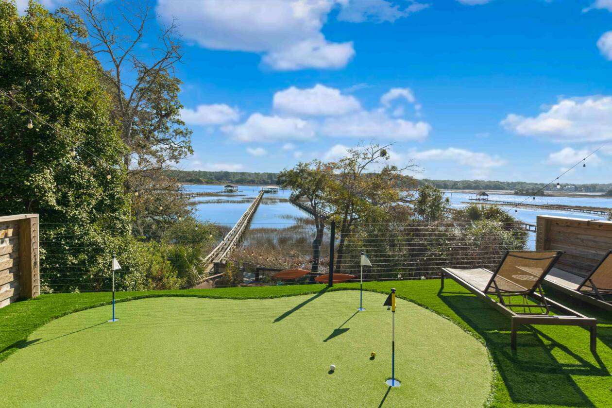 Outdoor living is layered across four covered porches, a ground-level patio, and a rooftop deck offering sweeping 360-degree vistas. The main-level back porch feels like a private waterfront club, featuring a gas fireplace, putting green, and a fully appointed outdoor kitchen with gas cooktop, grill, wine chiller, and extra refrigeration. Just beyond, a waterside fire pit overlooks the Stono River, and the fenced backyard provides a secure space for pets to roam. An outdoor shower and four-car garage complete the lower level, where a separate-entry guest or in-law suite offers flexibility for multigenerational living or potential rental income.