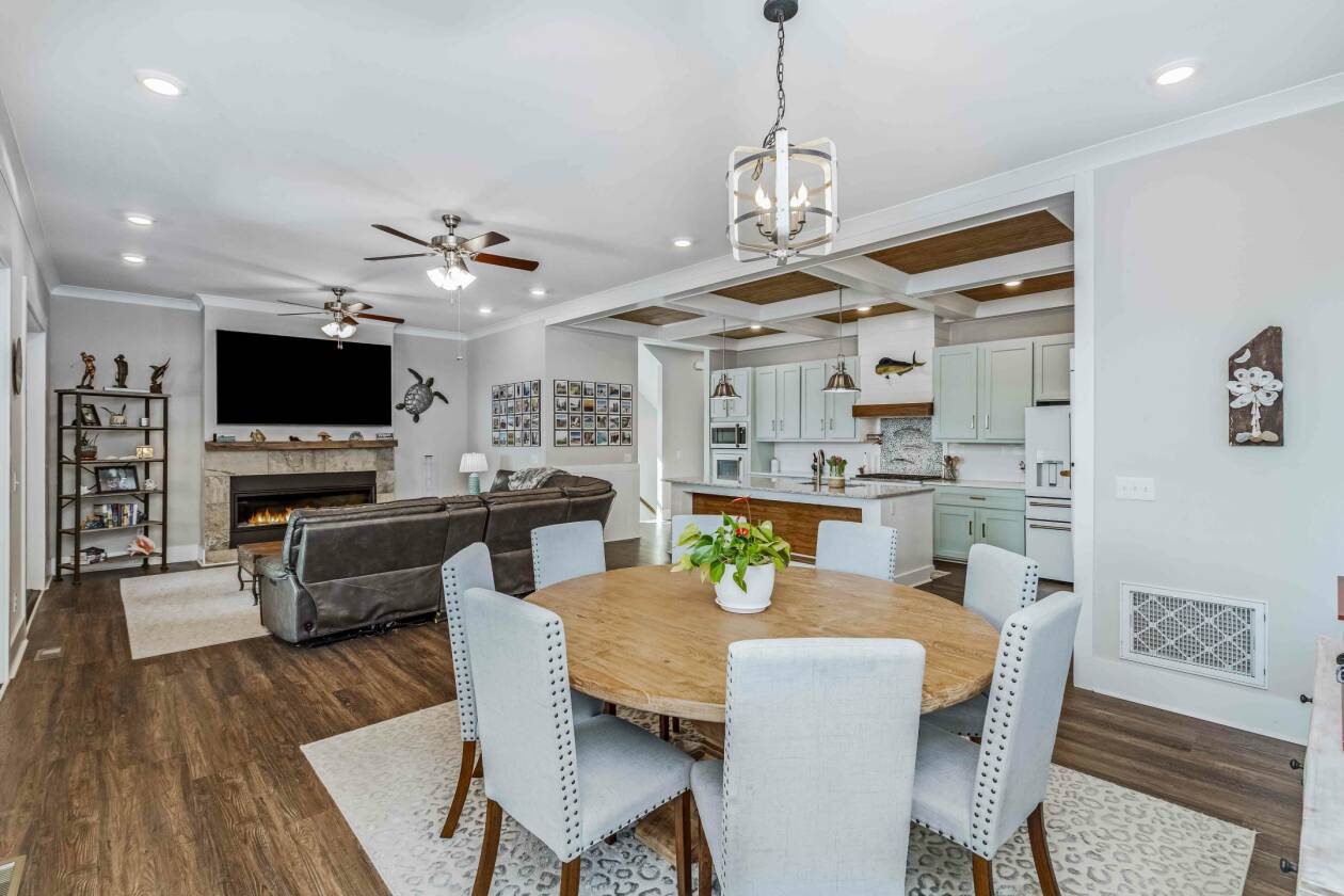 Inside, the main living level welcomes you with soaring eleven-foot ceilings and eight-foot mahogany doors, where walls of glass and French doors frame uninterrupted 180-degree views of the river and marsh. The open floor plan was created for gathering, flowing seamlessly from the great room with its inviting gas fireplace into a coastal chef’s kitchen that blends function with artistry. Anchored by the GE Café Suite, including a six-burner stovetop, double ovens, convection microwave, dishwasher, and beverage chiller, the space is elevated further by quartz countertops, a custom fish mosaic backsplash, a copper sink, a pot filler, coffered ceilings, and a generous walk-in pantry complete with its own coffee bar. From here, doors open directly to the expansive back porch, often affectionately called the “party porch,” where evenings unfold with family and friends.