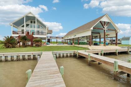 This home in Sargent, Texas is on 2 Lots in Caney Creek Haven!! This one is waiting for YOU!!! It is and EXQUISITE CUSTOM HOME is a 4 Bedroom 3.5 Bath, completed in 2022 and comes tastefully FURNISHED!!! It features vaulted ceilings, granite/quartz countertops, top of the line GE appliances, on-demand water heater, gas log fireplace and more! Complete with an oversized boathouse with remote control lift you can be ready to go boating, fishing, cruising at a moment's notice. So much room inside and out for entertaining family and friends with an open concept kitchen/dining/living, a covered porch up and tons of room downstairs. This one is A KEEPER! It is professionally decorated, boasting a glass balcony/stainless steel staircase rail, oversized breakfast bar, 6 burner gas cooktop, Double ovens and a convection microwave. Sargent is the gateway to the Gulf of America including local Bait Camps, restaurants and parks. The Regional Airport and 2 Golf courses are within 30 minutes and only 90 minutes to Houston!