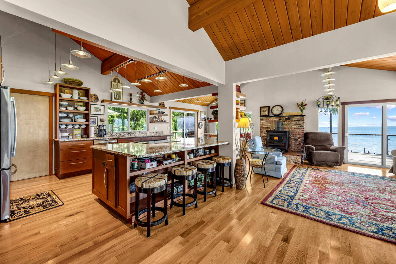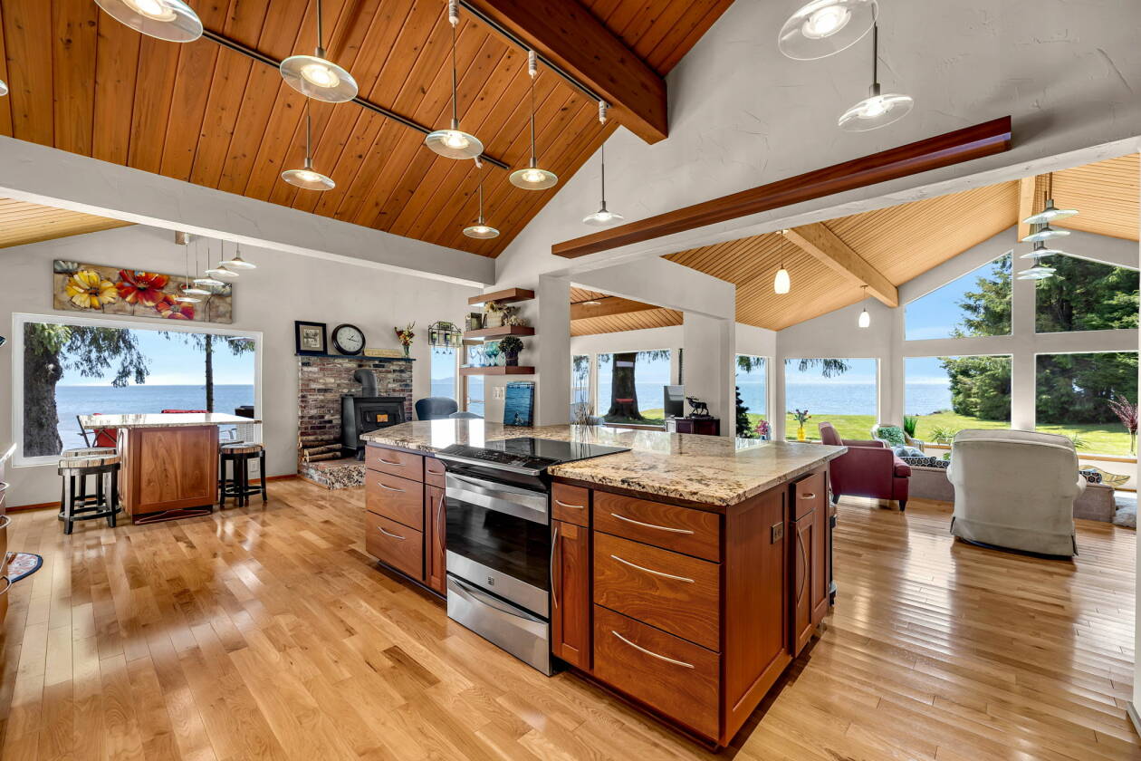 The living room is anchored by a cozy fireplace, perfect for chilly Northwest evenings. The kitchen is spacious, with plenty of cabinetry, updated appliances, and a large island that serves as the heart of the home. Whether you’re preparing a holiday feast or enjoying a casual meal, this space is designed for connection.